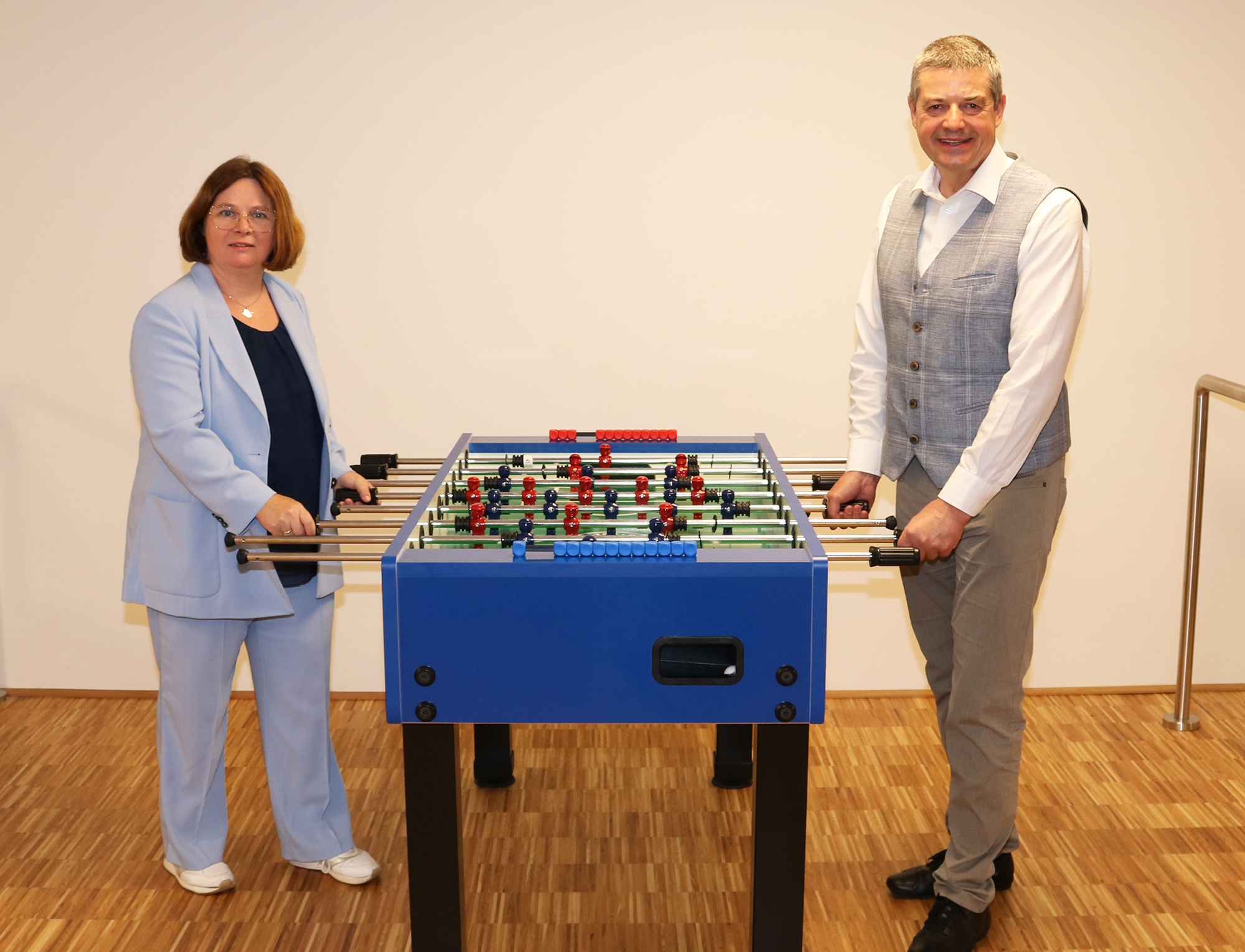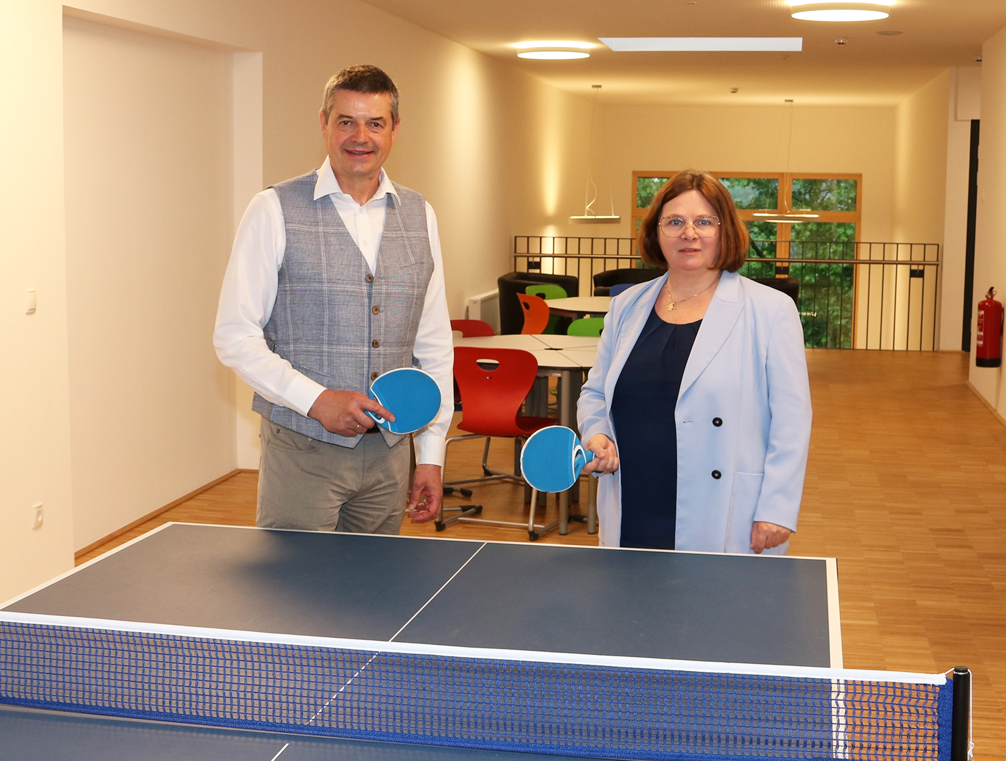 So konnte Dir. Wilfried Lercher nach Abschluss der Großbaustelle von EV-Obfrau Mag. Gabriele Pickl-Pratscher in den letzten Monaten mehrere vom Elternverein finanzierte Freizeitgeräte wie Wuzzler und Indoor-Tischtennistisch zur aktiven Pausengestaltung übernehmen.