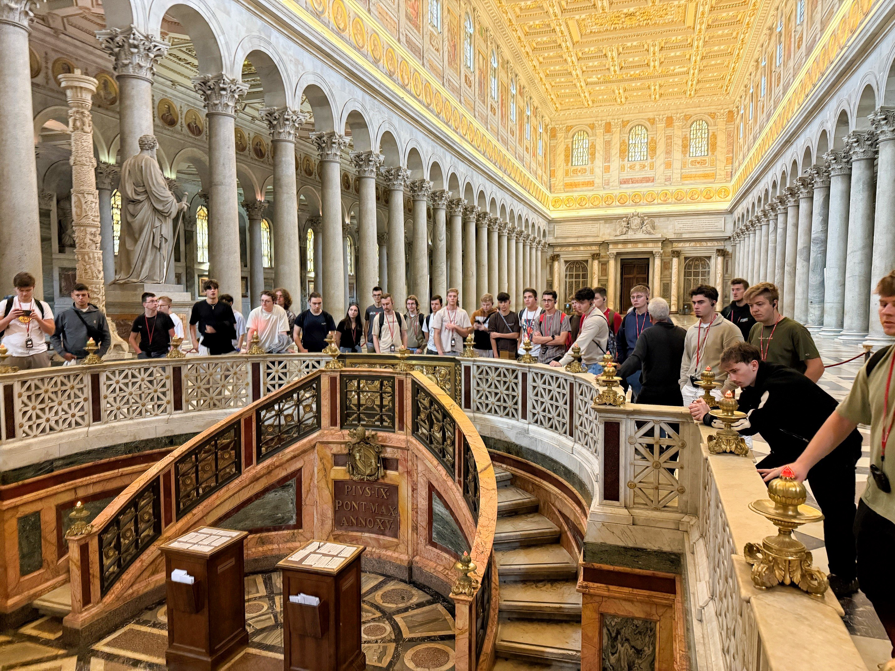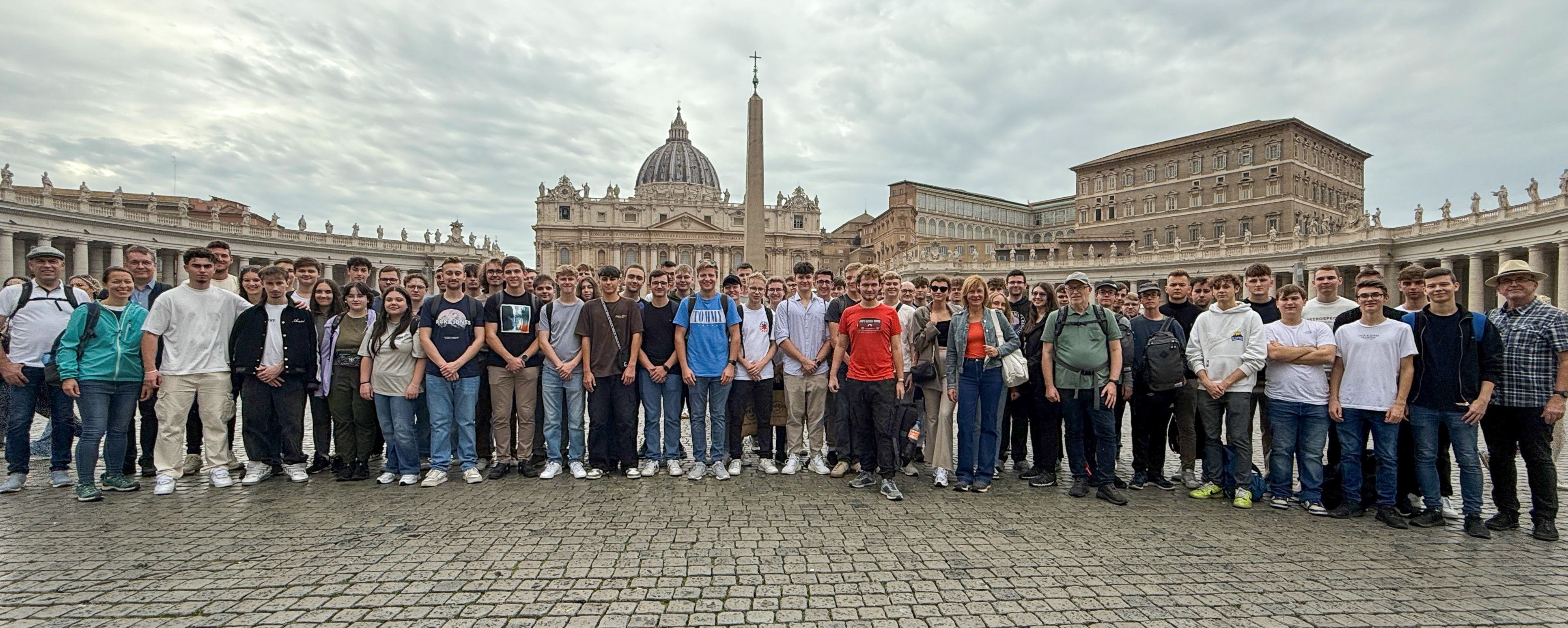 „Alle Wege führen nach Rom…“ Die Schüler und Schülerinnen der 5. Jahrgänge der Elektronik- und Informatikabteilung lernten Italiens Hauptstadt bei frühlingshaften Temperaturen im Oktober im Rahmen ihrer Abschlusslehrfahrt kennen. Besichtigt wurden das Pantheon, die Spanische Treppe, das Kolosseum, das Forum Romanum, St. Paul vor den Mauern, der Lateran – um einige Sehenswürdigkeiten zu nennen. Ein Tagesausflug führte nach Ostia, ans Meer, und in die Albaner Berge, wo die „Magnetstraße“ für Staunen sorgte. Auch der Petersdom wurde besichtigt und nach Erklimmen der Stufen der Peterskuppel wurde man mit einer großartigen Aussicht auf den Petersplatz und Umgebung belohnt.