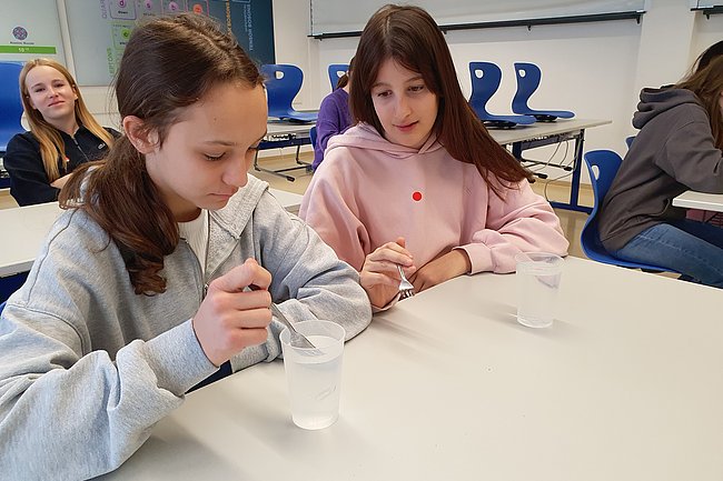 Spannende Nawi-Experimente zeigte Herr Prof. Tkauz. Die Schüler*innen durften z.B. erleben wie ein Marshmallow in Vakuum reagiert und die Oberflächenspannung von Wasser erforschen.