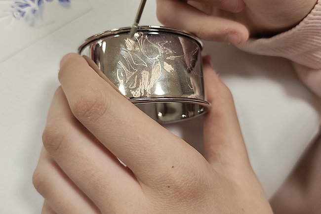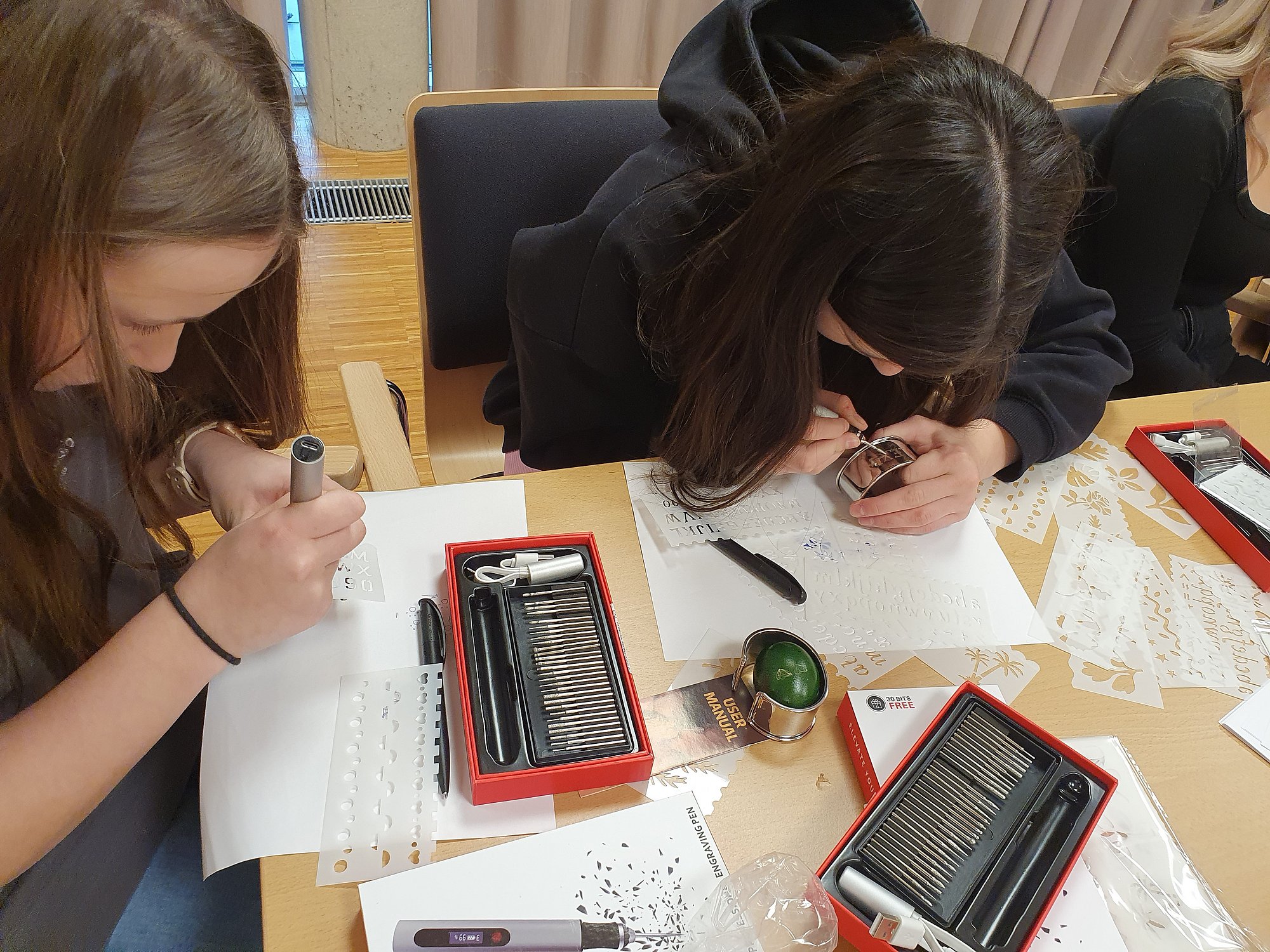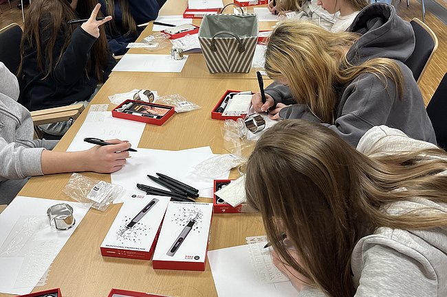 Mit Frau AV Prof.in Rehling erprobten sich die Mädchen in Metallbearbeitung, in dem Armbänder graviert wurden. Passend zu Ostern wurden mit den Gravierstiften auch Ostereier gestaltet. Besonders beeindruckt zeigten sich die Schüler: innen von den Werkstätten, welche ebenso kurz besichtigt werden konnten. Im Zug der Mint Region Oberwart gelang es, einen spannenden und lehrreichen Gebäudetechnik Vormittag für Mädchen zu gestalten.