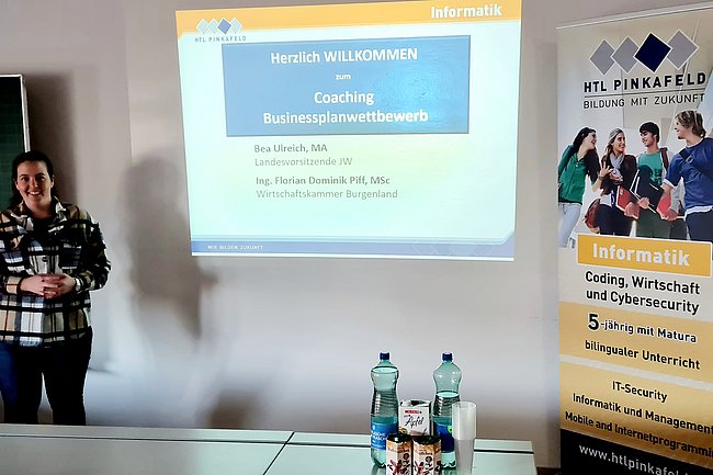 Ende März fand ein externes Coaching der Teams durch die zwei Vertreter der Wirtschaftskammer Burgenland Bea Ulreich MA und Ing. Florian Piff MSc statt. Die Teams starteten mit einem dreiminütigen Pitch, in dem sie ihre Geschäftsidee eindrucksvoll vorstellten, und erhielten danach individuelles Feedback zu ihren Vorhaben. Danach gaben die beiden externen Coaches mit ihrer mehrjährigen Erfahrung in der Gründungsszene wertvolle Tipps zum Gestalten von Businessplänen. In dieser lockeren Diskussionsrunde erfuhren die Schülerinnen und Schüler auch, dass Kundenorientierung an oberster Stelle stehen müsse und das Austesten der Geschäftsidee an möglichen Kunden immens wichtig sein, um herauszufinden, ob die Idee überhaupt realisierbar sei.