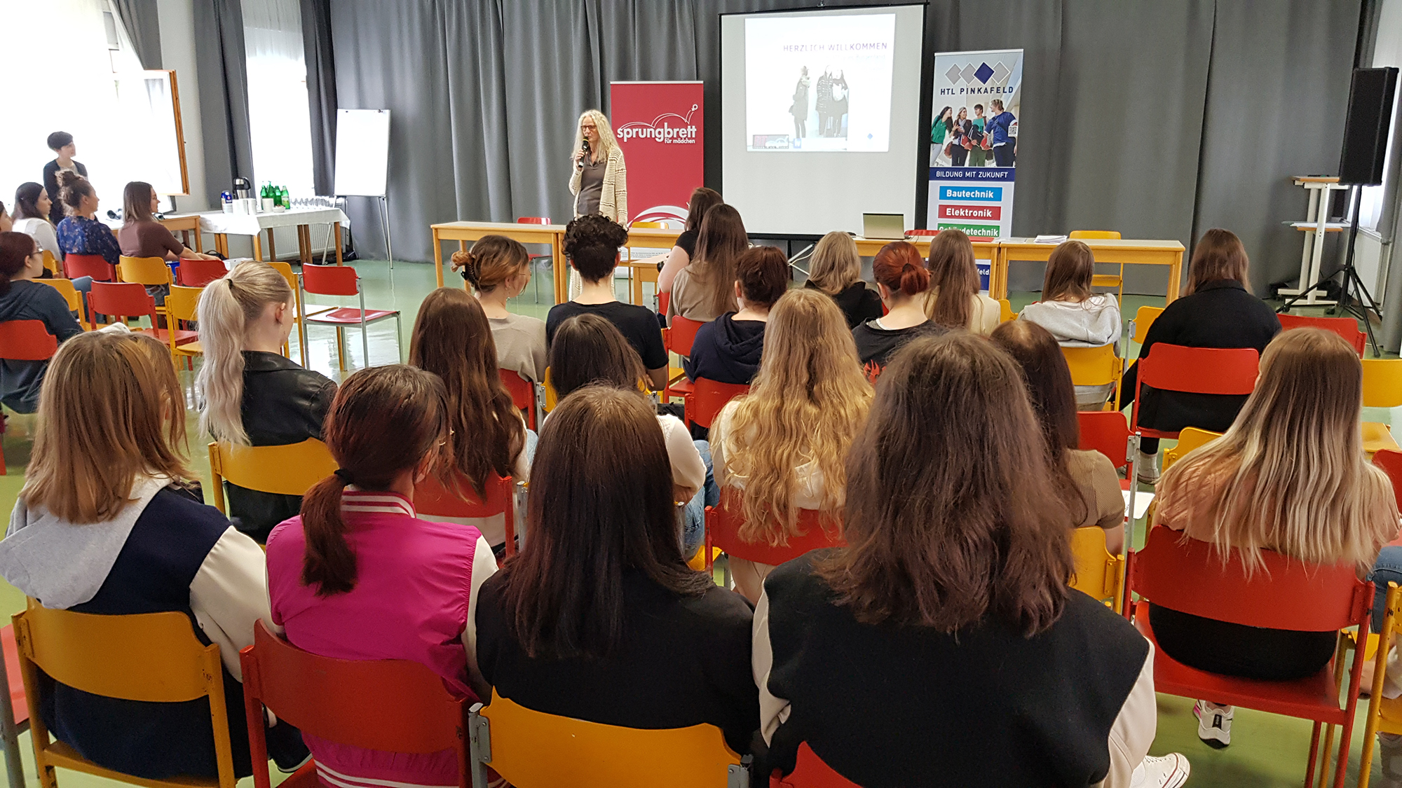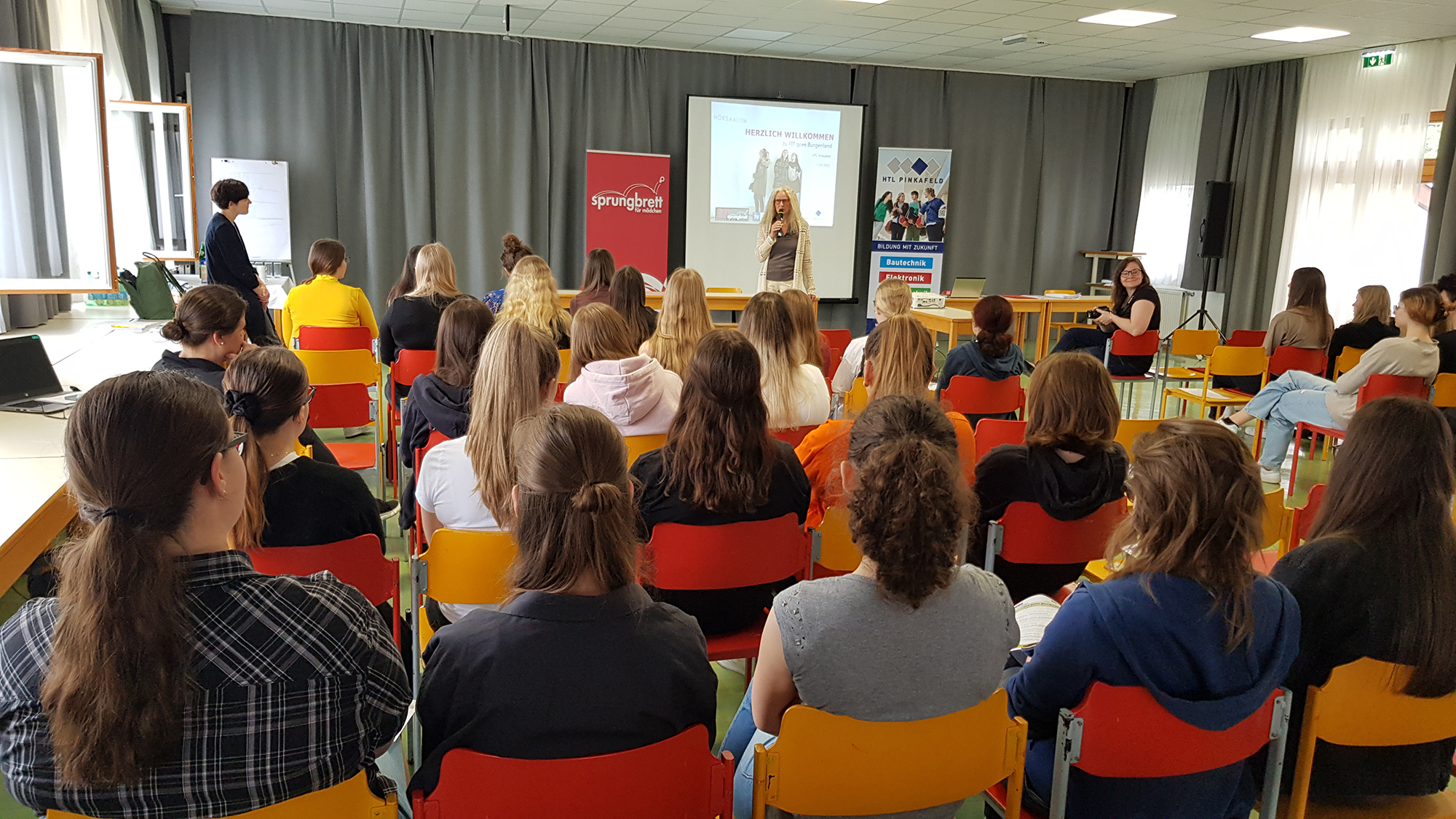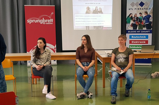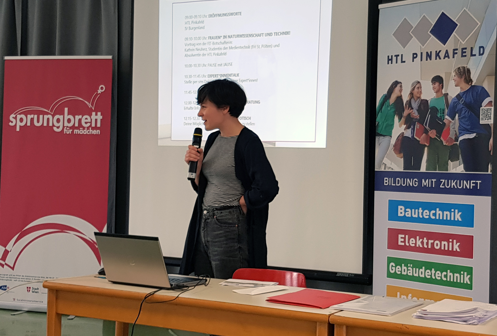 Ingrid Puschautz-Meidl von der Industriellenvereinigung Burgenland und BSc Antonia Schmid von FIT Sprungbrett hielt FIT-Botschafterin Kathrin Neuherz, selbst Absolventin der HTL Pinkafeld, die Eröffnungsrede und informierte über die Informationsmöglichkeiten durch FIT Sprungbrett. Weiters fand sie ermutigende Worte an die anwesenden HTL-Schülerinnen der 3. und 4. Jahrgänge aller vier Abteilungen, auch nach Abschluss der HTL Weiterbildungsmöglichkeiten im MINT Bereich in Angriff zu nehmen und in der Technik zu bleiben.