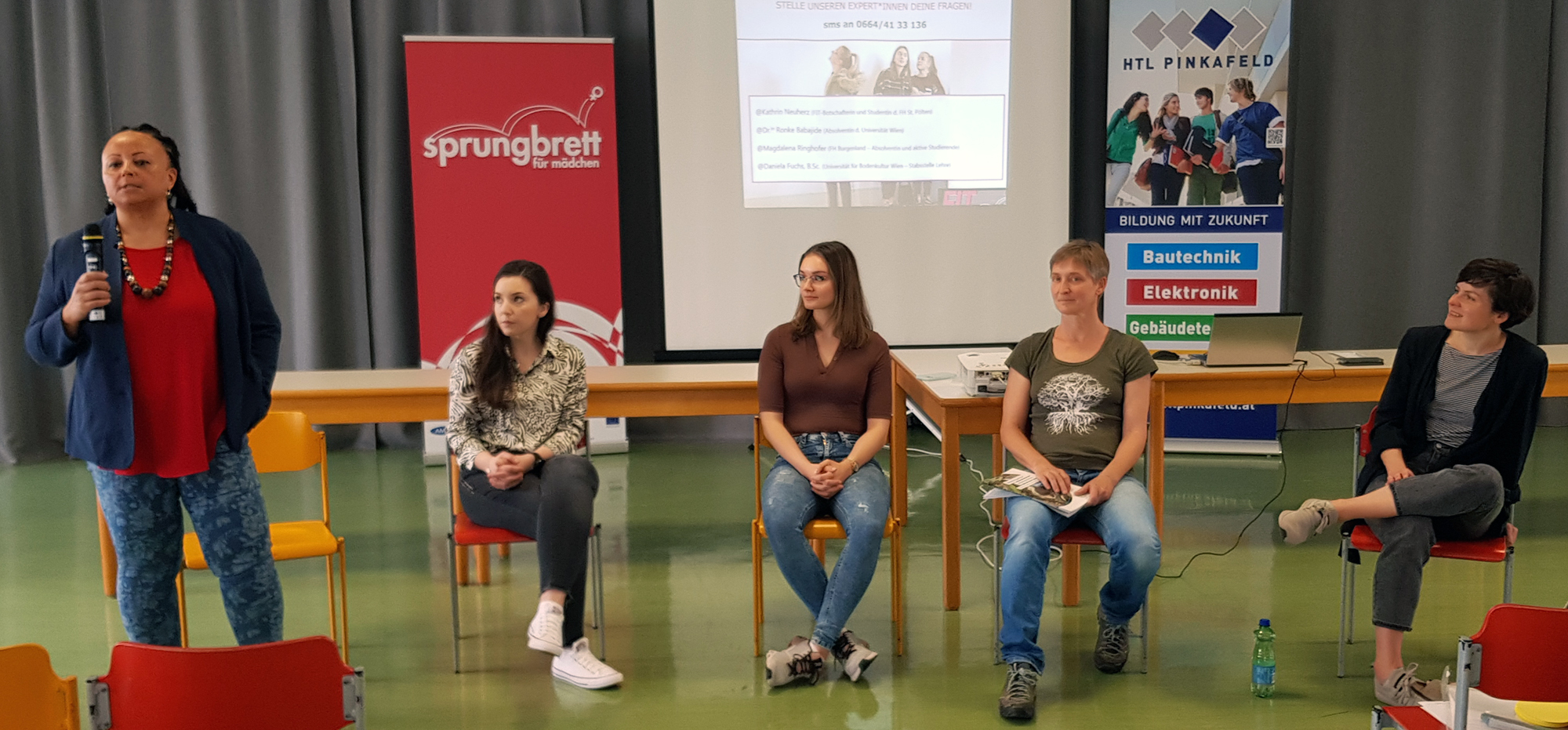 Im Anschluss hatten die Schülerinnen die Möglichkeit, an die Expertinnenrunde Kathrin Neuherz, Studentin der FH St. Pölten, Dr.in Ronke Babajide, Role Model und Absolventin der Universität Wien, BA MA Sabine Zant von der FH Burgenland, Marketing und Kommunikation, BSc Daniela Fuchs von der Universität für Bodenkultur Wien, Stabsstelle Lehre, Fragen zu stellen. Dabei wurden verschiedene Themen wie Werdegang der Expertinnen, Jobaussichten, Verdienstmöglichkeiten, Aufstiegschancen, Durchsetzungsvermögen gegenüber Männern, aber auch die Bewältigung von Selbstzweifel, Umgang mit Vorurteilen von Frauen in der Technik, Erwerbung von Kompetenzen, Mut für Neues und vieles mehr aufgegriffen. Die Expertinnen hatten unterschiedliche Zugänge zu den jeweiligen Themen und konnten zahlreiche hilfreiche Tipps geben. Alle waren sich über die Wichtigkeit einig, dass mehr Mädchen und Frauen technische Berufe ergreifen sollen.