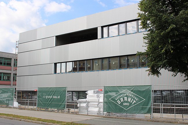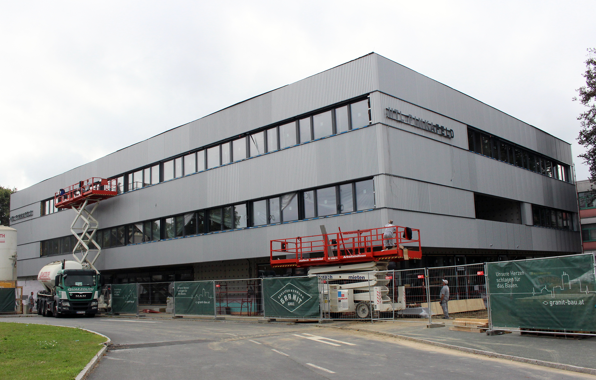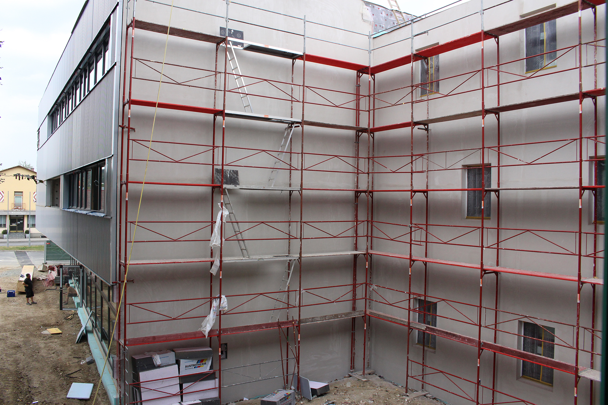 In den Ferien wurden die Arbeiten innen und außen am neuen Zubau der HTL Pinkafeld zügig fortgesetzt. So sind weite Teile der Fassade bereits gedämmt und verblecht bzw. verputzt, auch der Innenausbau schreitet weiter voran.