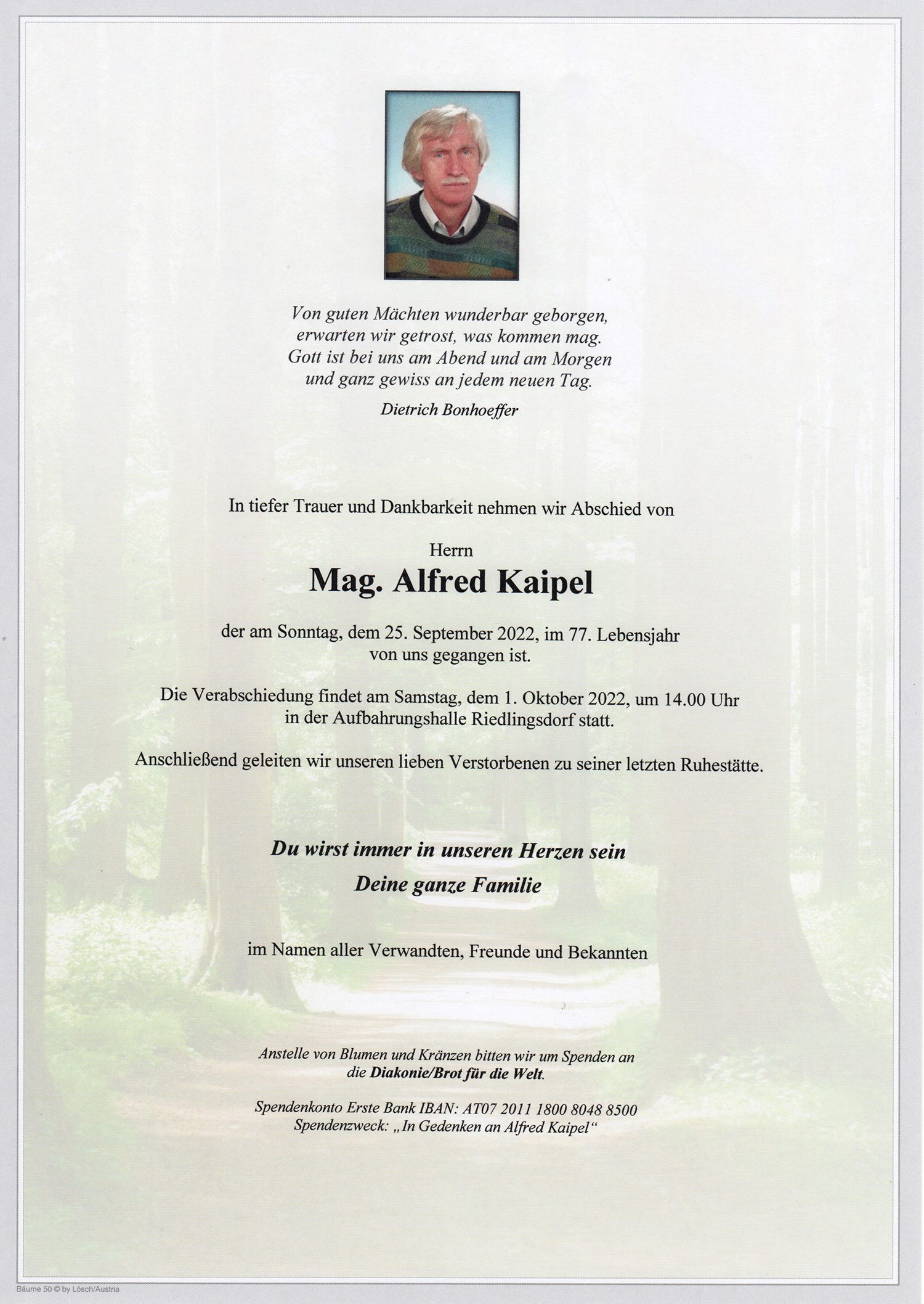 Die Schulgemeinschaft der HTL Pinkafeld trauert um Oberstudienrat Prof. Mag. Alfred Kaipel. Er ist am Sonntag, 25. September 2022, nach schwerer Krankheit verstorben.