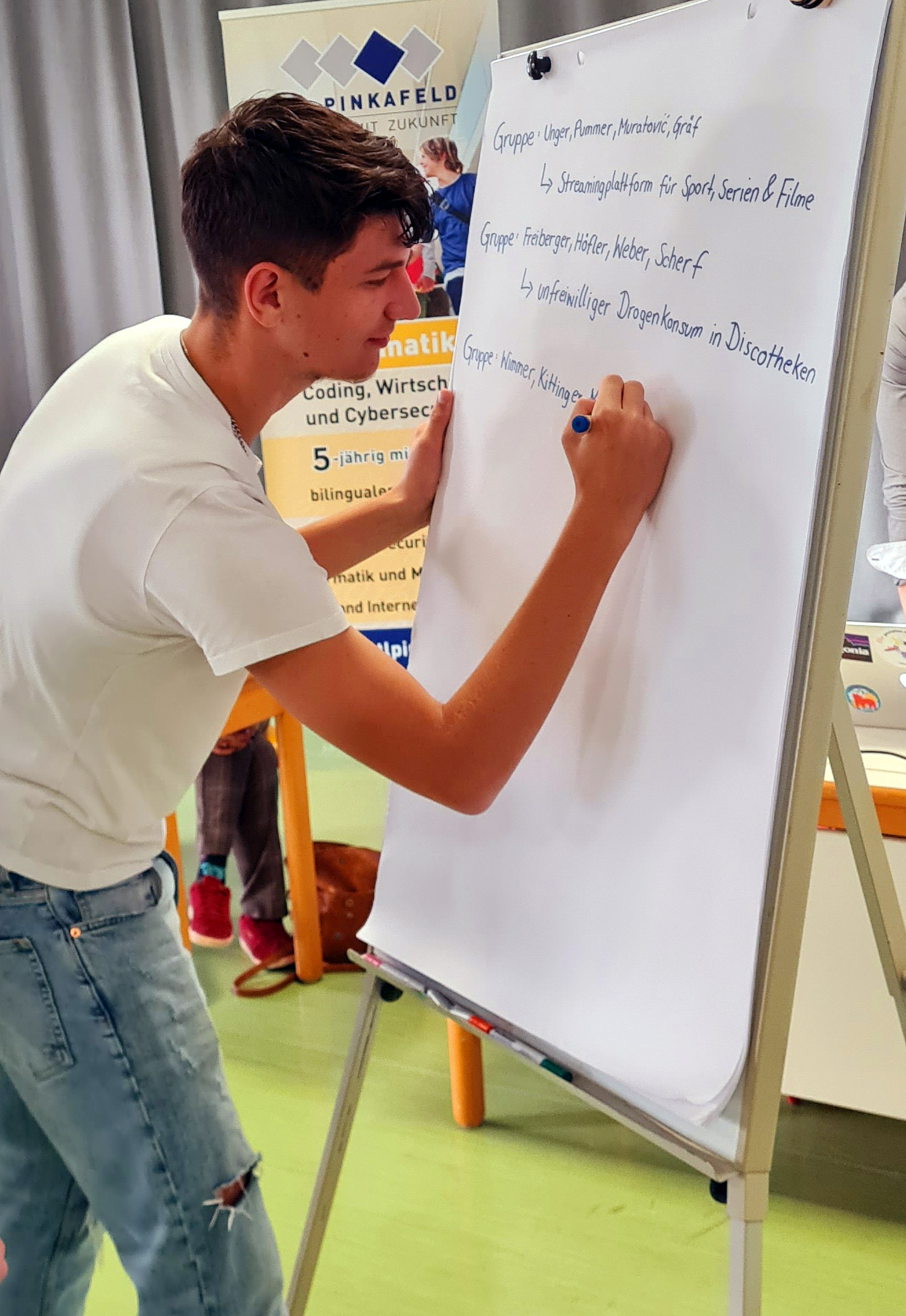 Die Jugendlichen waren bei der Themenwahl frei, wobei als Problemfelder ihre persönlichen Interessen und Erfahrungen aus dem Alltag sowie gesellschaftliche Trends dienten. Im Vorfeld zur Entrepreneurship-Week wurde ein Problemjournal geführt, aus denen sich dann die Geschäftsideen herauskristallisiert hatten. Während der Week wurde an der Geschäftsidee gefeilt, sie wurde von allen Seiten beleuchtet, eine Umfrage dazu gemacht und schließlich eine Präsentation dazu ausgearbeitet. In einem 3minütigen Pitch mit anschließenden Fragen der Jury legten die Schülerinnen und Schüler eindrucksvoll ihr Geschäftskonzept dar.