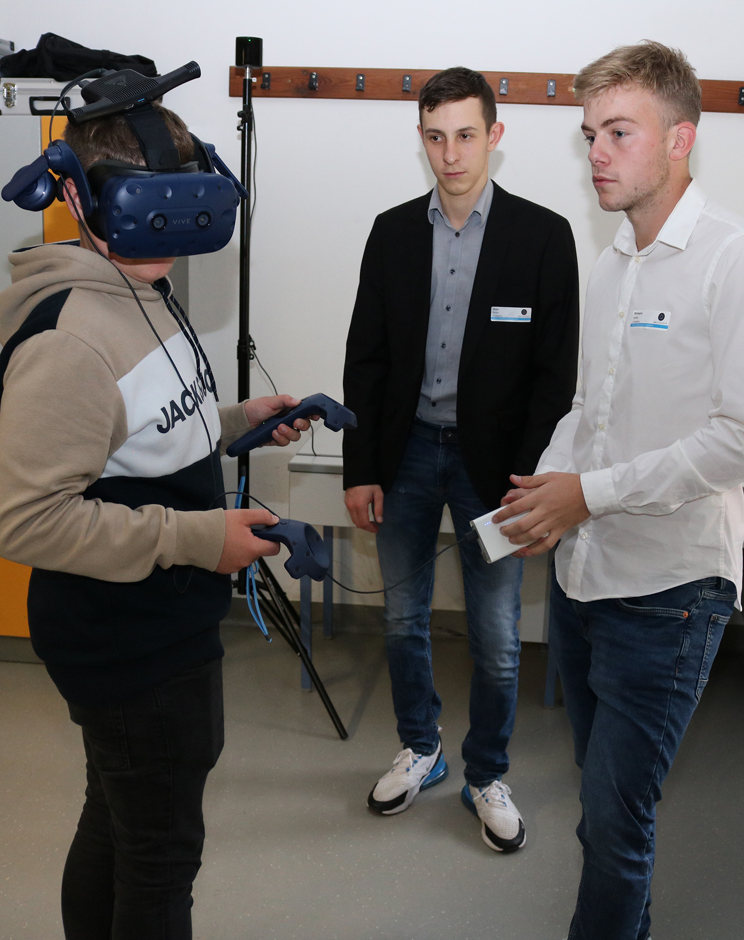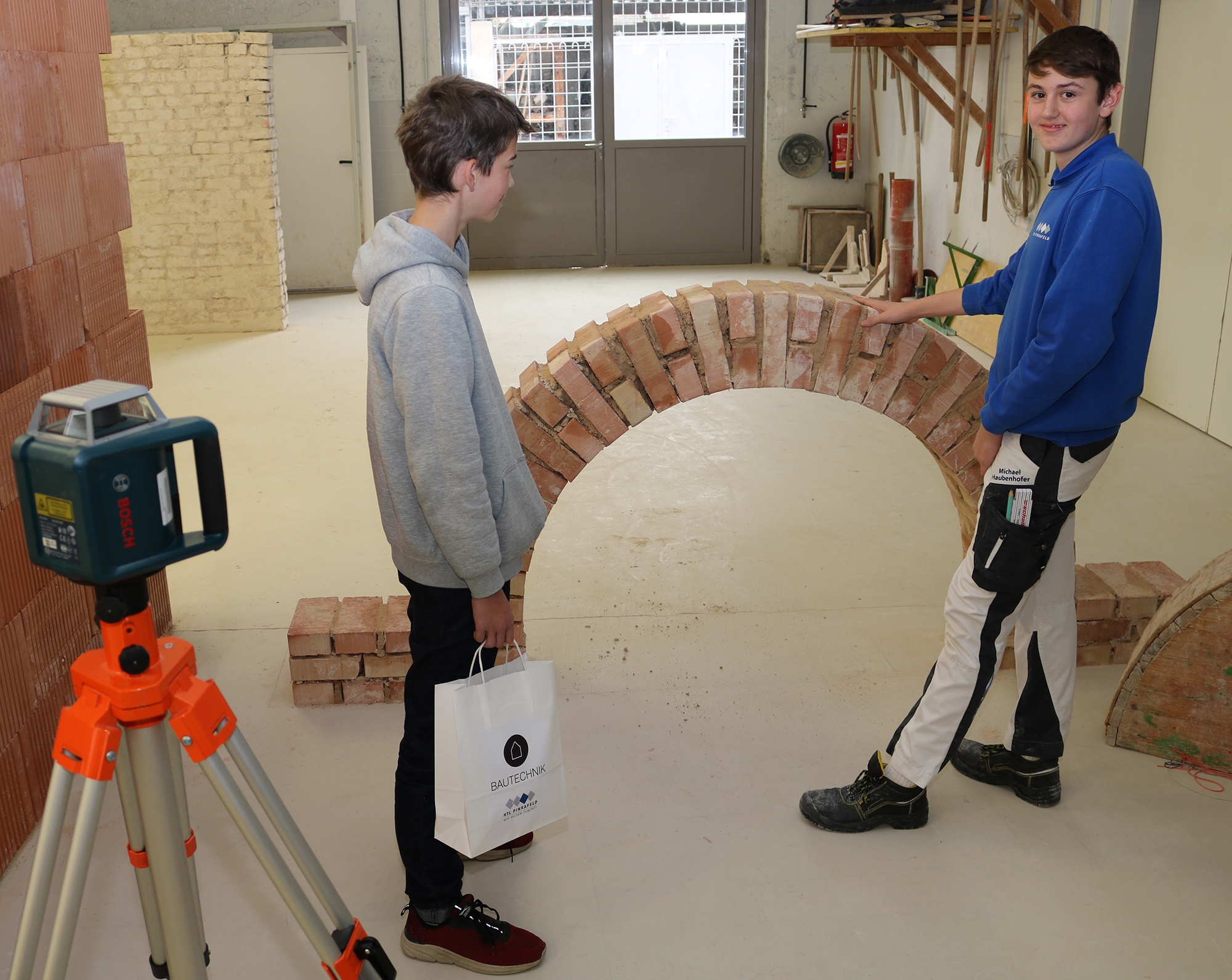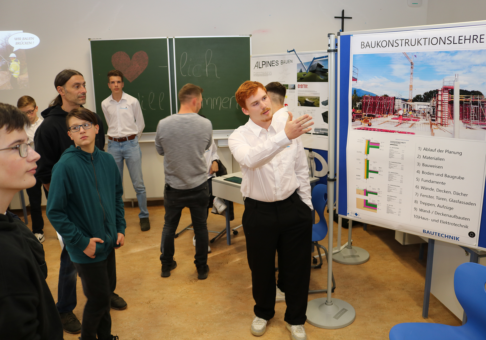 So wurden die verschiedenen Aspekte des Unterrichts anhand der Gegenstände und von Diplomarbeiten erläutert. Im Baulabor wurden Holz- und Betonversuche durchgeführt, die Zukunft des virtuellen Bauens wurde mittels VR-Brille sowie 3D-Scannen und -Drucken demonstriert und die Wärmebildkamera zeigte am Modellhaus sehr anschaulich potentielle Schwachstellen. Wesentliche Teile des fachpraktischen Unterrichts in der Zimmerei und Maurerei konnten am Ende des Rundgangs selbst ausprobiert werden.
