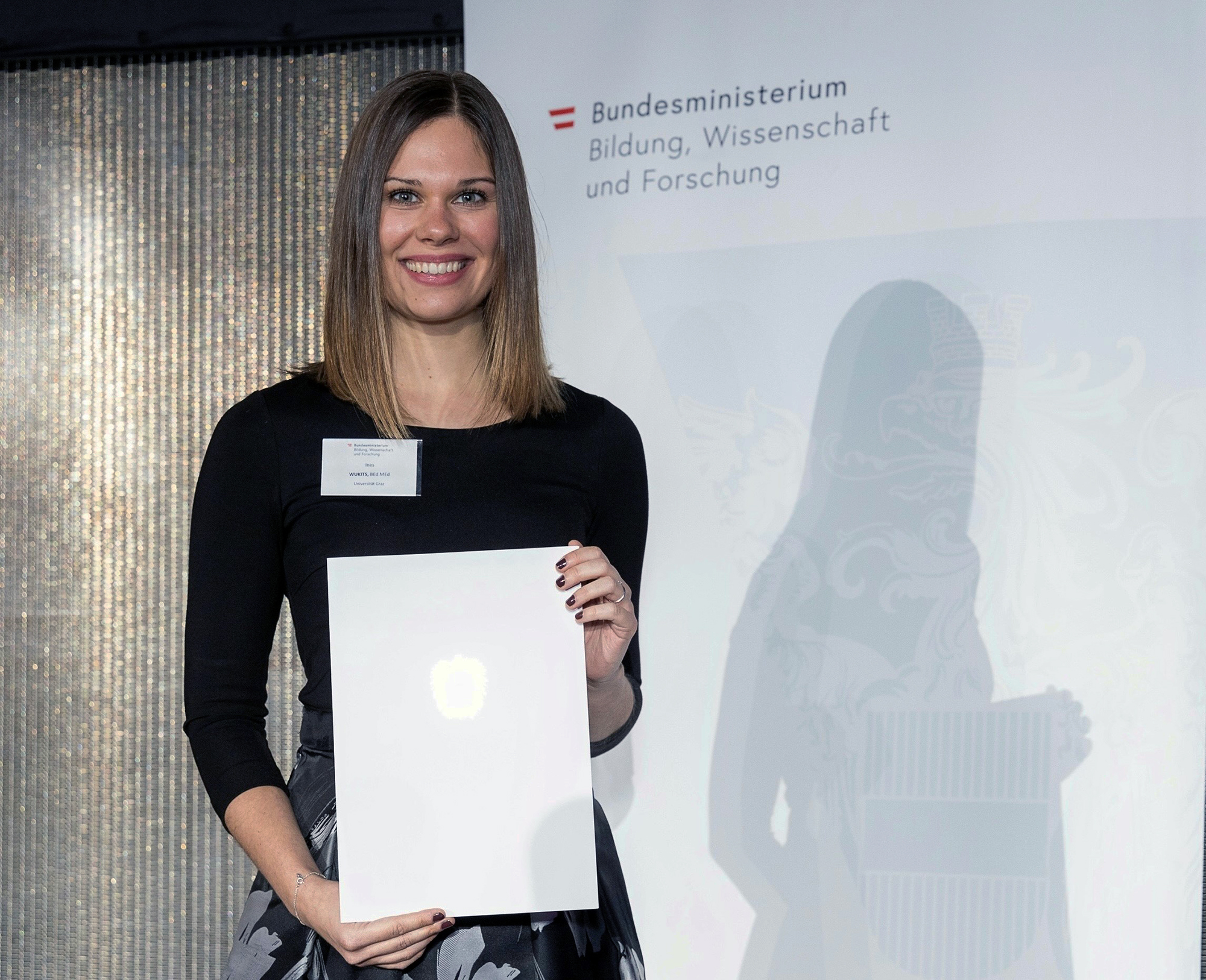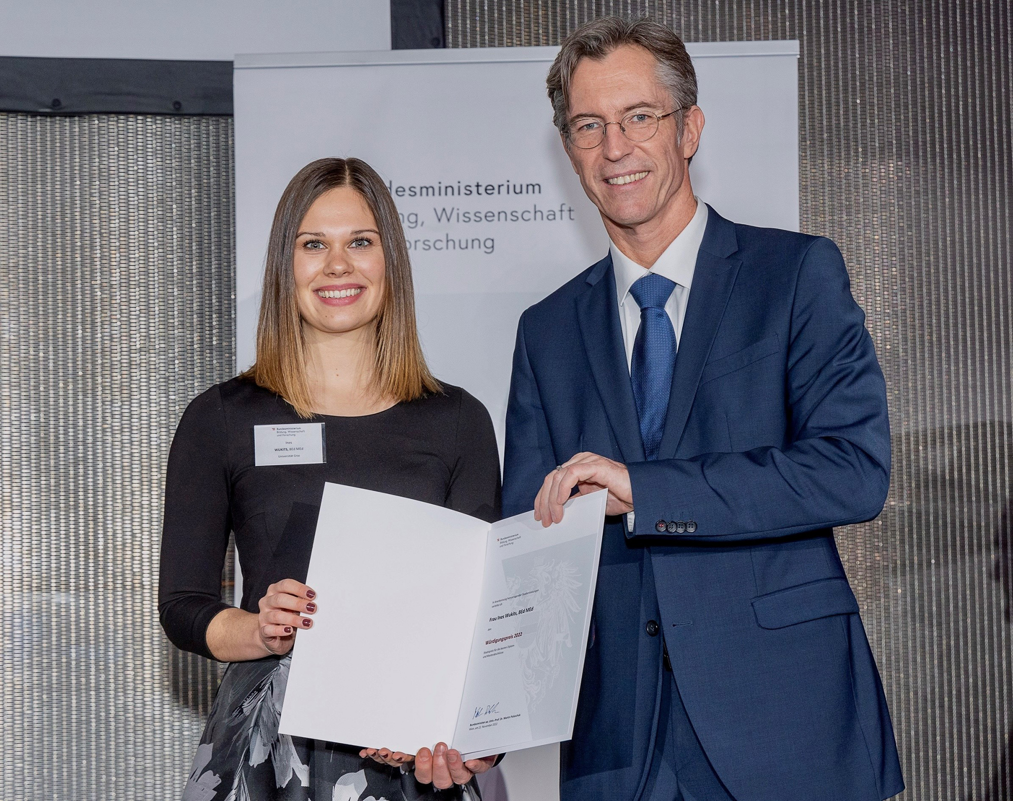 Mit dem seit 1990 vergebenen Würdigungspreis des Bildungsministeriums werden jährlich die 55 besten Diplom- und Masterabschlüsse an allen österreichischen Universitäten, Fachhochschulen und Pädagogischen Hochschulen – von insgesamt rund 16.000 Abschlüssen jährlich – ausgezeichnet. Voraussetzungen dafür sind die Ablegung der Masterprüfung mit Auszeichnung, eine hervorragende und bestbeurteilte Masterarbeit und die gesetzliche Studienzeit darf um nicht mehr als höchstens zwei Semester überschritten werden. Prof. Ines Wukits erhielt diesen Würdigungspreis am 22. November in der Aula der Wissenschaften in Wien.