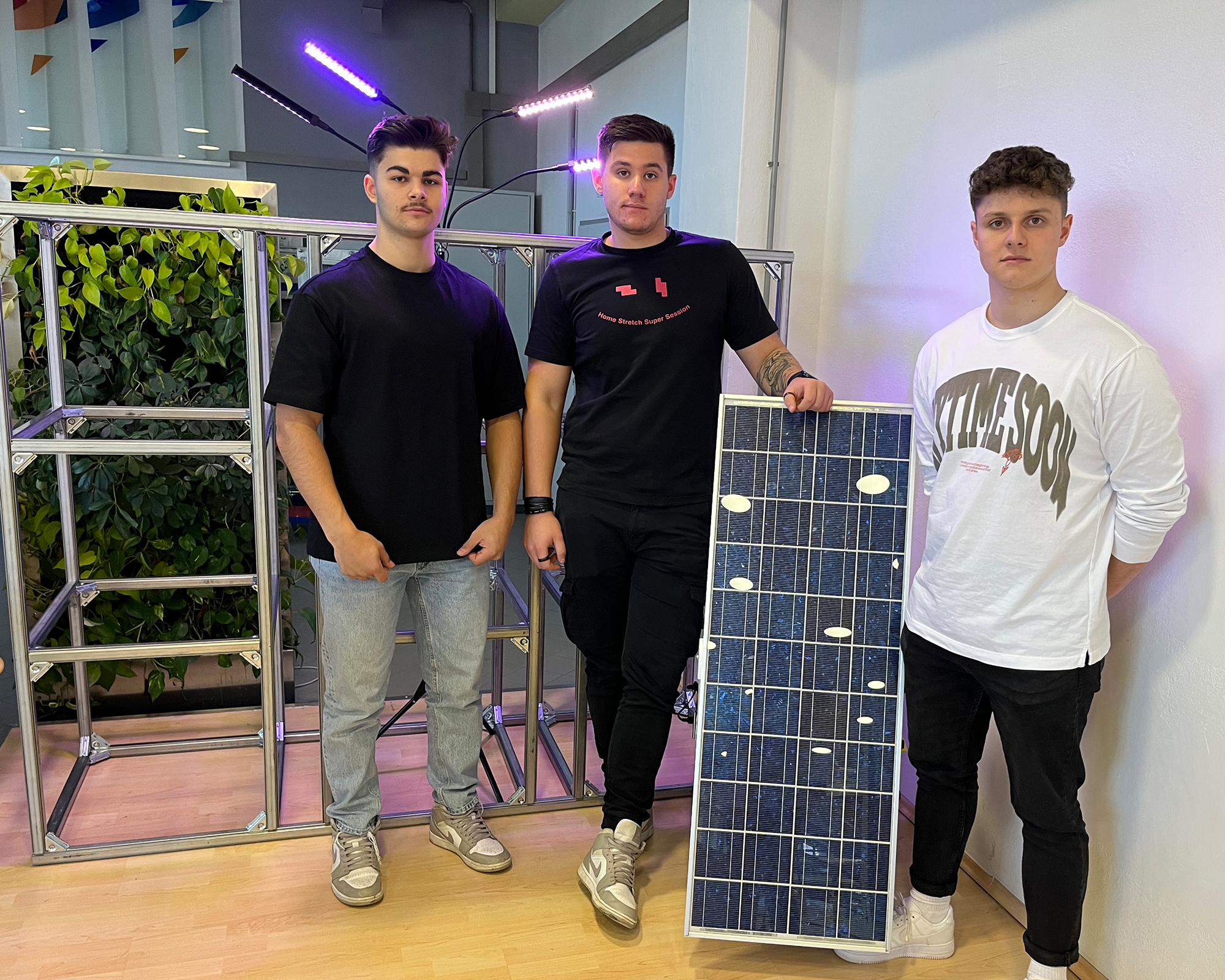 Dies Schüler stecken mitten in der Errichtung eines Laborstandes für das Testen verschiedener Konstellationen, unter welchen Voraussetzungen und unter Einsatz möglichst günstiger und sauberer Energien Pflanzen bestmöglich gedeihen. Dabei kommen unterschiedliche Nährlösungen, Temperatur- und Windverhältnisse sowie unterschiedliche Lichtverhältnisse zum Einsatz. Ein Ziel ist es herauszufinden, unter welchen Voraussetzungen die Produktivität am größten ist.