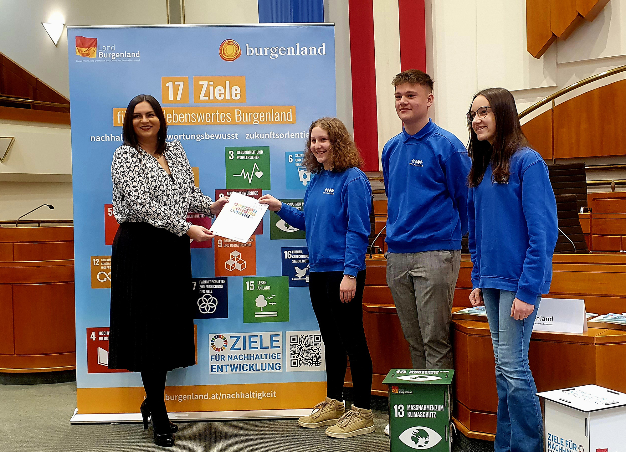 Clara Buchegger, Felix Knabel und Helena Lorenschitz präsentierten ihre Ausarbeitungen und Ideen im Landtagssitzungssaal in Eisenstadt und übergaben in Begleitung der Professorinnen Birgit Stephan und Judith Fenz ihren Klimavertrag an Landeshauptmann-Stv. Astrid Eisenkopf. Die Vorschläge der Schülerinnen und Schüler werden Teil der burgenländischen Nachhaltigkeitsziele sein.