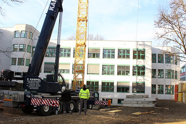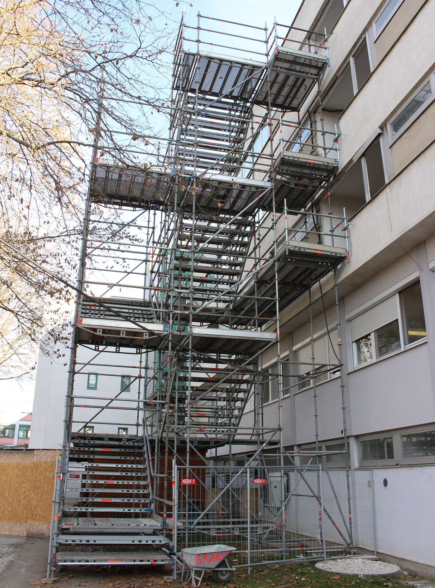 Dafür wurden in den letzten Tagen u.a. der Baustellenbereich verlegt, ein großer Drehturmkran in Betrieb genommen und eine Notfalltreppe für den als Ausweichquartier fungierenden Internatstrakt errichtet.