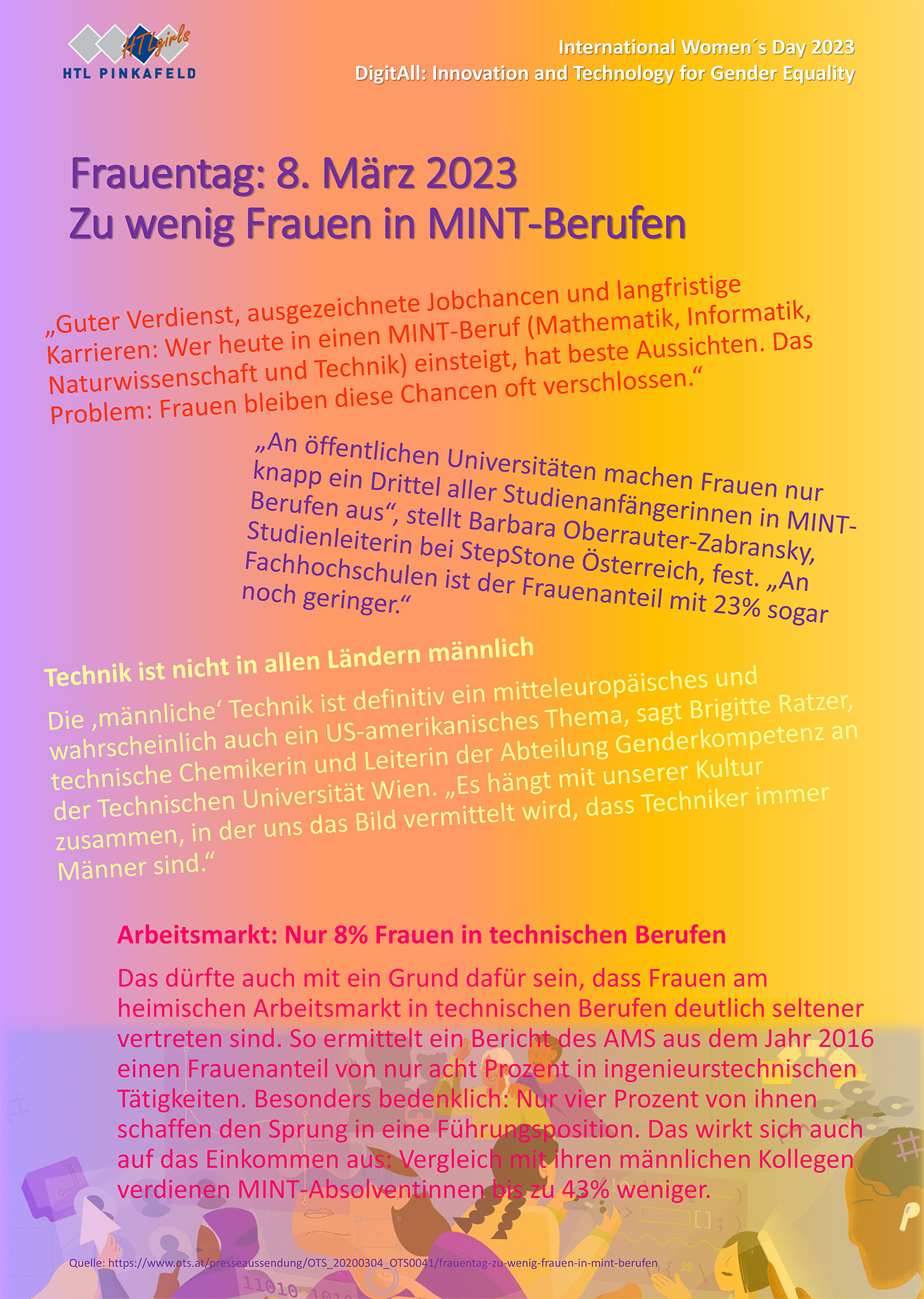 Auf der Homepage der UN Women Austria ist das diesjährige Thema für den Internationalen Frauentag am 8. März 2023 (IWD 2023) zu finden: “DigitALL: Innovation and technology for gender equality”. Technologien werden weitgehend von Männern kreiert, genutzt und reguliert. Frauen bleiben weiterhin unterrepräsentiert, nutzen weniger digitale Dienste und wählen seltener technikbezogene Berufe. Geschlechtsspezifische Gewalt und Belästigung online stellen außerdem ein großes Problem dar. Der technologische Fortschritt bringt nicht nur neue Formen von Ungleichheiten mit sich, sondern verstärkt auch die Bedrohung der Rechte und des Wohlbefindens von Frauen und Mädchen. Dennoch bietet das digitale Zeitalter auch Möglichkeiten zur Stärkung von Frauen und Mädchen.