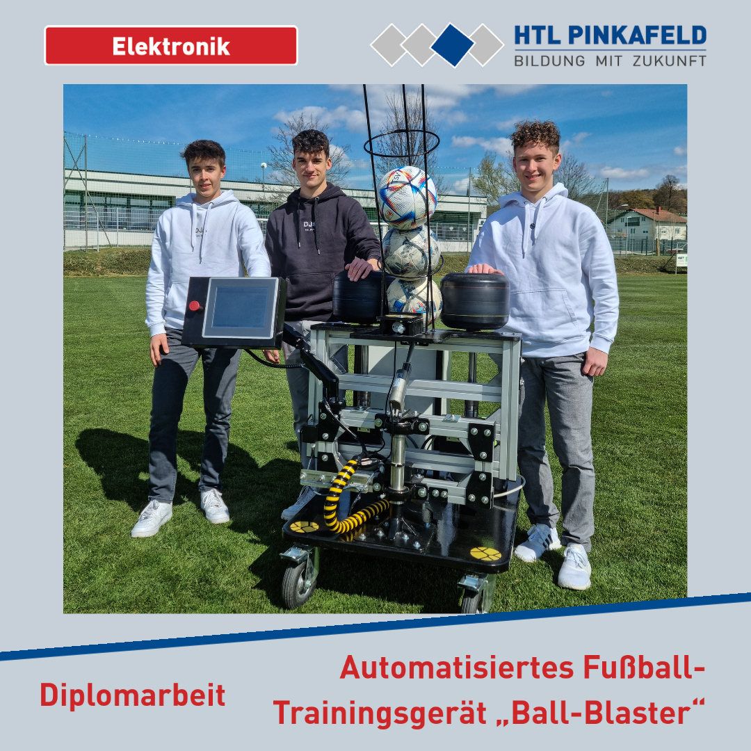 Ende März wurde die Diplomarbeit „Ball-Blaster“ der Elektronik-Maturanten Andreas Vollnhofer, Jakob Schlögl und David Heissenberger fertiggestellt und präsentiert. Betreut wurde die Arbeit von Ing. Rainer Pinter, u.a. soll es auch im Trainingsprogramm der HTL-Fußballklassen eine fixe Verwendung finden.