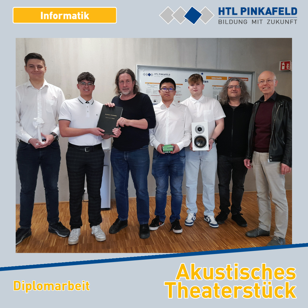 Mitte April wurde die Informatik-Diplomarbeit „Akustisches Theaterstück“ von den Maturanten Tim Gyaki, Danien Berger, Niklas Knarr und Robert Jin an die Auftraggeber Paul Mühlbauer, Rainer Paul und Michael Holzhacker sowie den Betreuer Prof. Klaus Kirnbauer übergeben.