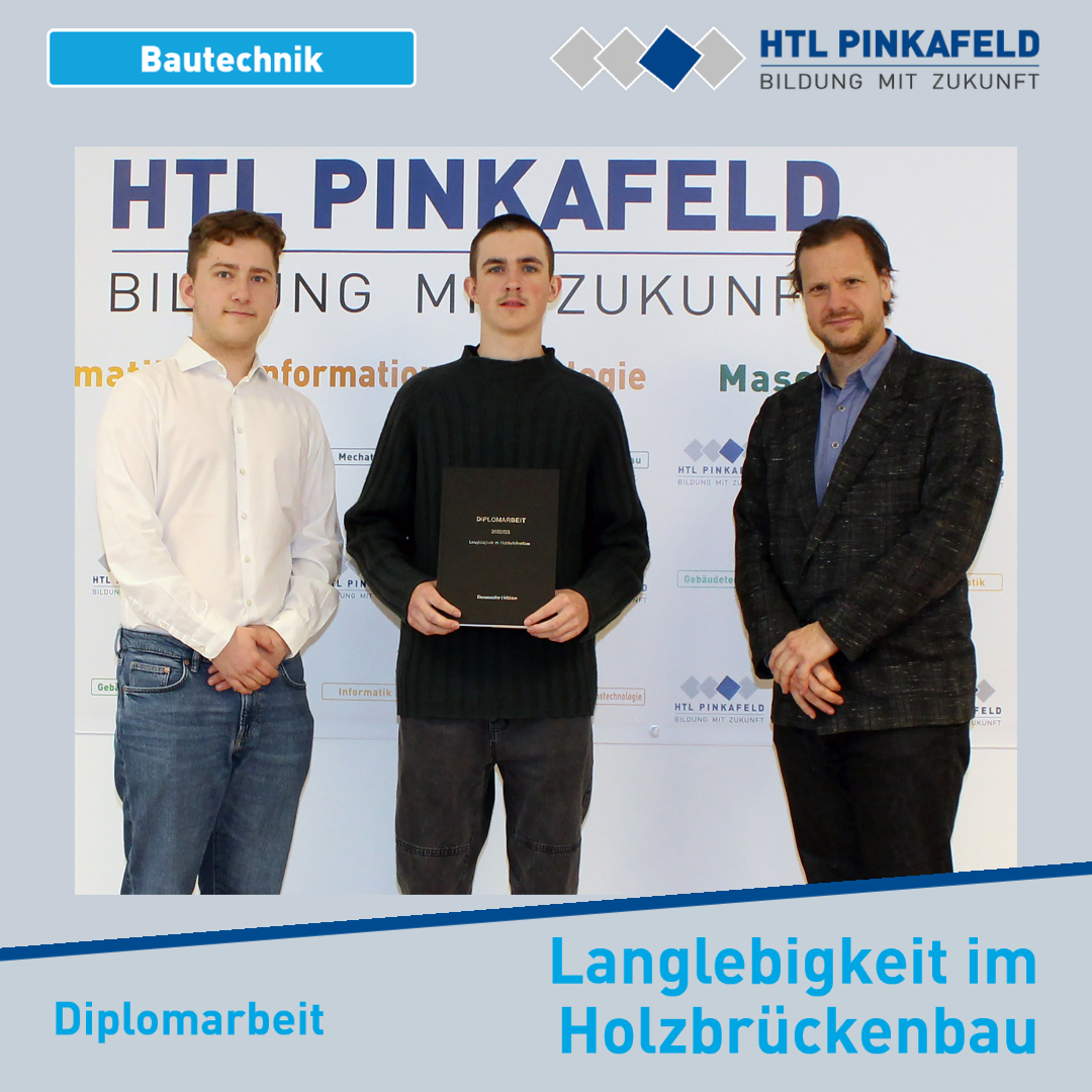 Kürzlich wurde die Diplomarbeit „Langlebigkeit im Holzbrückenbau durch Design und Wartung“ von den Bautechnik Maturanten Leonhard Dannemüller und Noah Möbius übergeben. Betreut wurde die Diplomarbeit von Prof. Wolfgang Leeb.