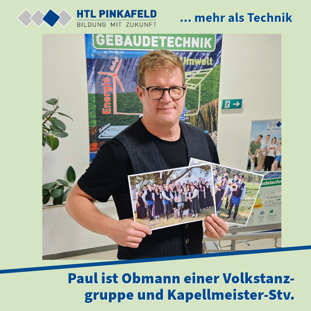 Paul ist Professor für Gebäudetechnik-Fachtheorie an der HTL Pinkafeld und in seiner Freizeit Obmann einer Volkstanzgruppe. Seine Leidenschaft am Tanz und Gesang sowie an der Musik generell kann er seit vielen Jahren als Musiker im örtlichen Musikverein aktiv ausleben und hat dort zusätzlich die Funktion des Kapellmeisterstellvertreters inne.