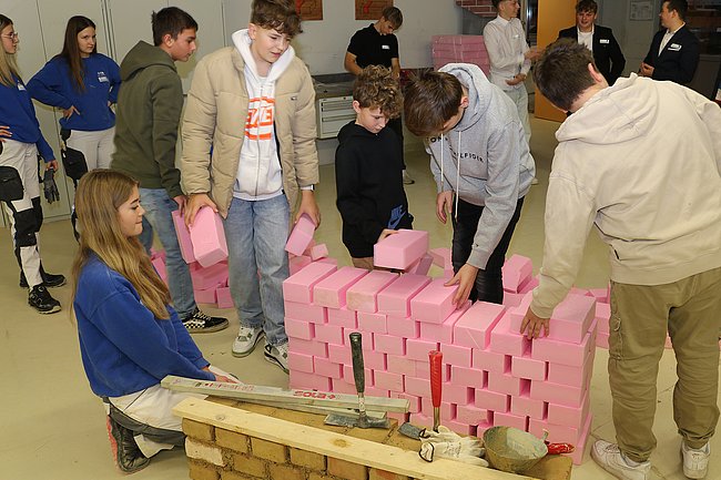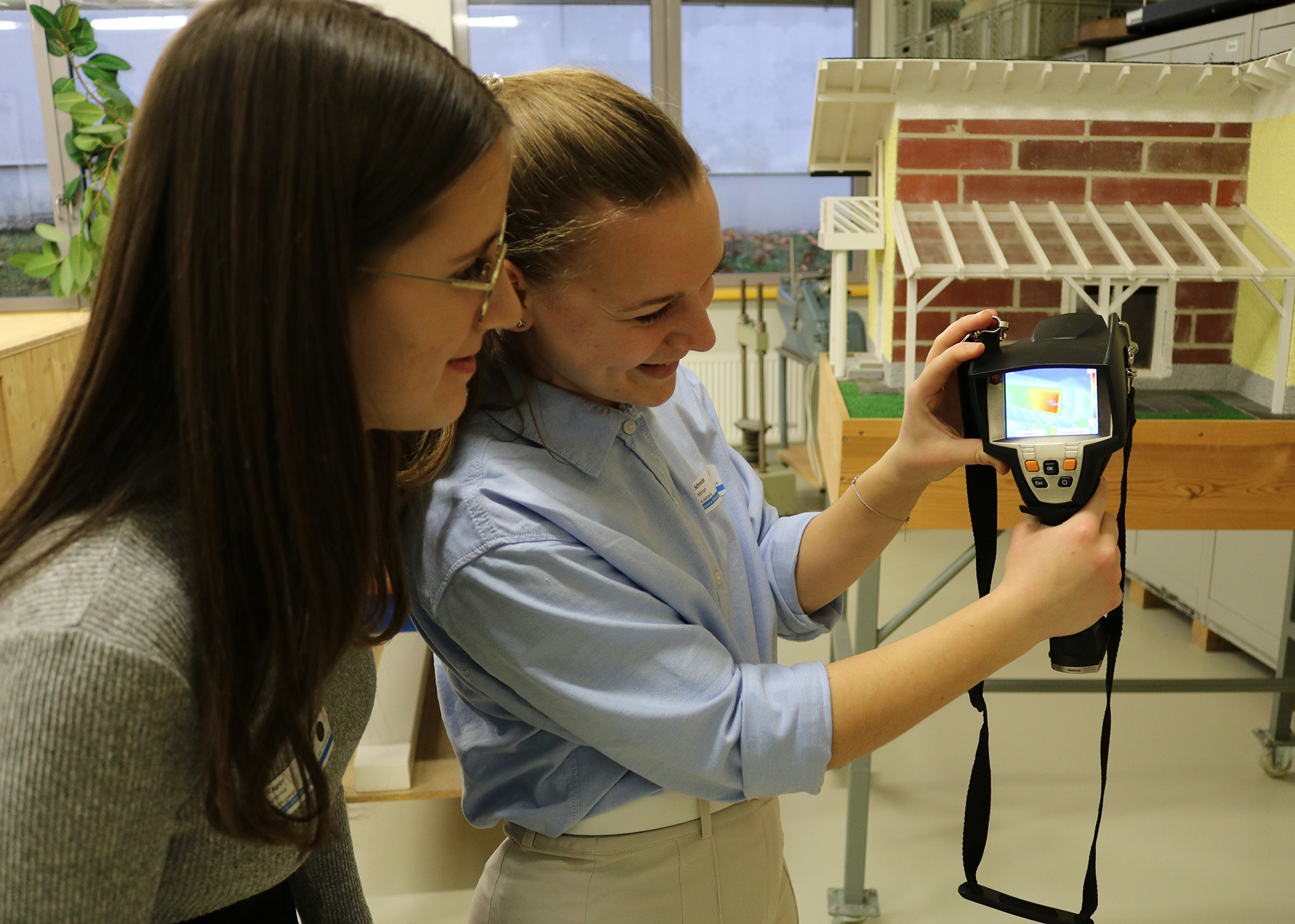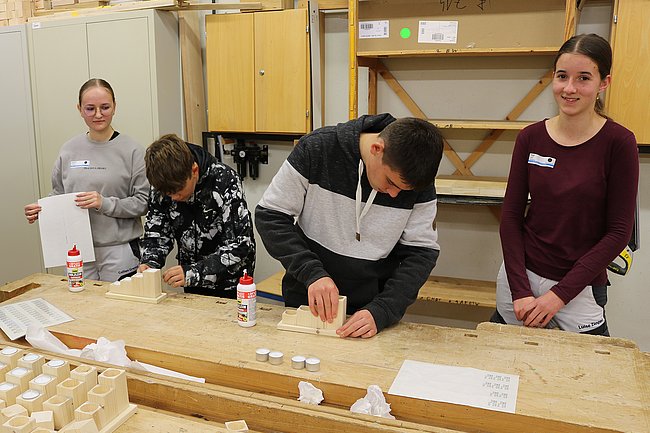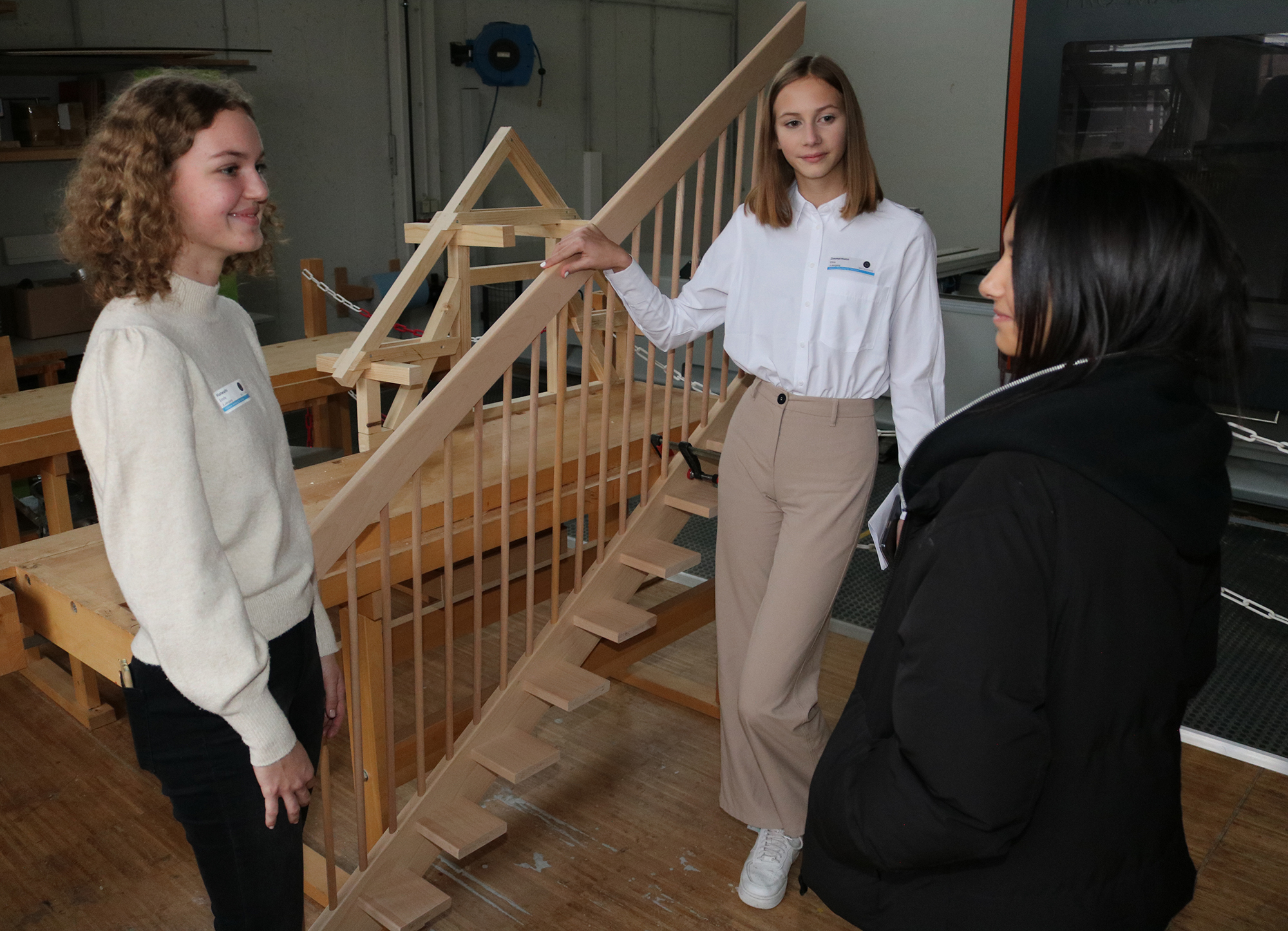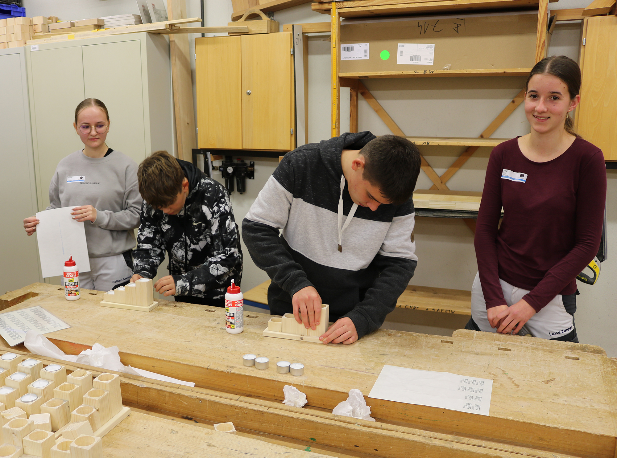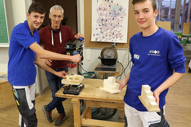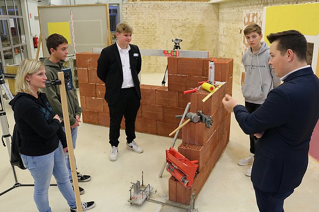 So wurden die verschiedenen Aspekte des Unterrichts anhand der Gegenstände und von Diplomarbeiten erläutert. Im Baulabor wurden Holz- und Betonversuche durchgeführt, die Zukunft des virtuellen Bauens wurde mittels VR-Brille sowie 3D-Scannen und -Drucken demonstriert. Die Wärmebildkamera zeigte am Modellhaus sehr anschaulich potentielle Schwachstellen. Wesentliche Teile des fachpraktischen Unterrichts in der Zimmerei und Maurerei konnten am Ende des Rundgangs selbst ausprobiert werden.