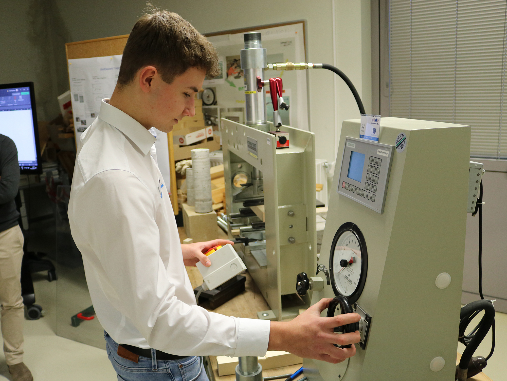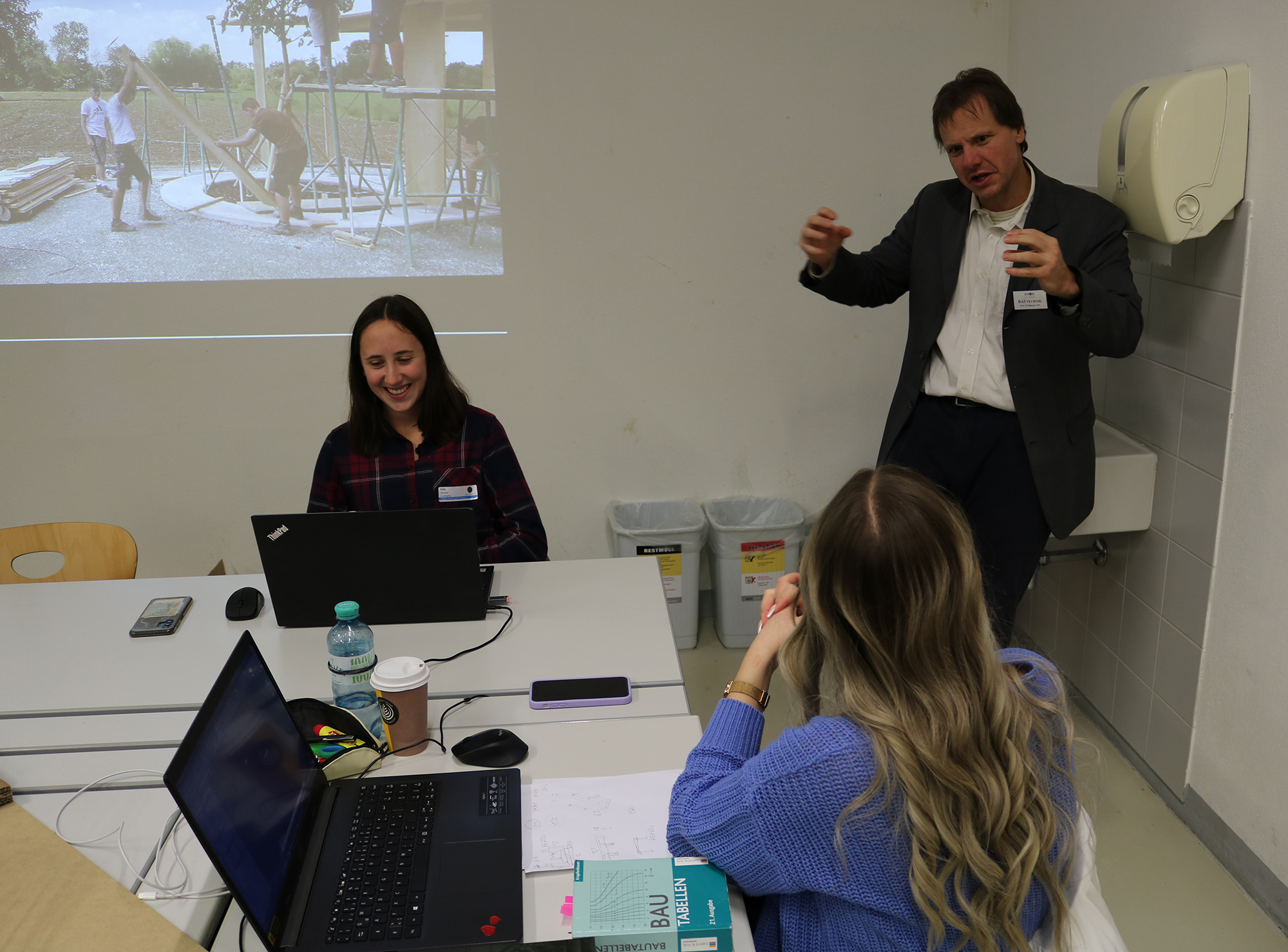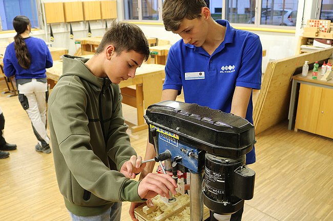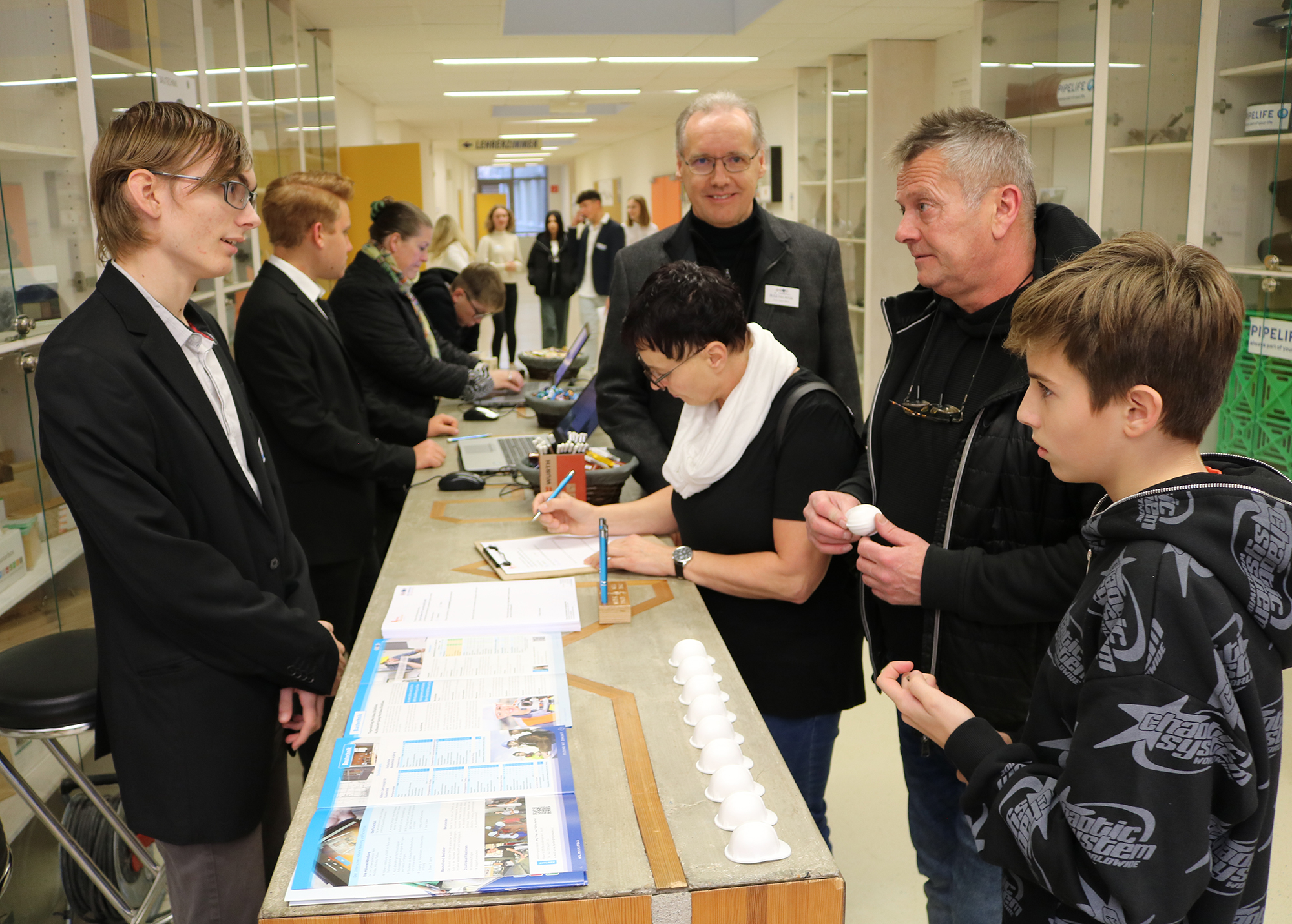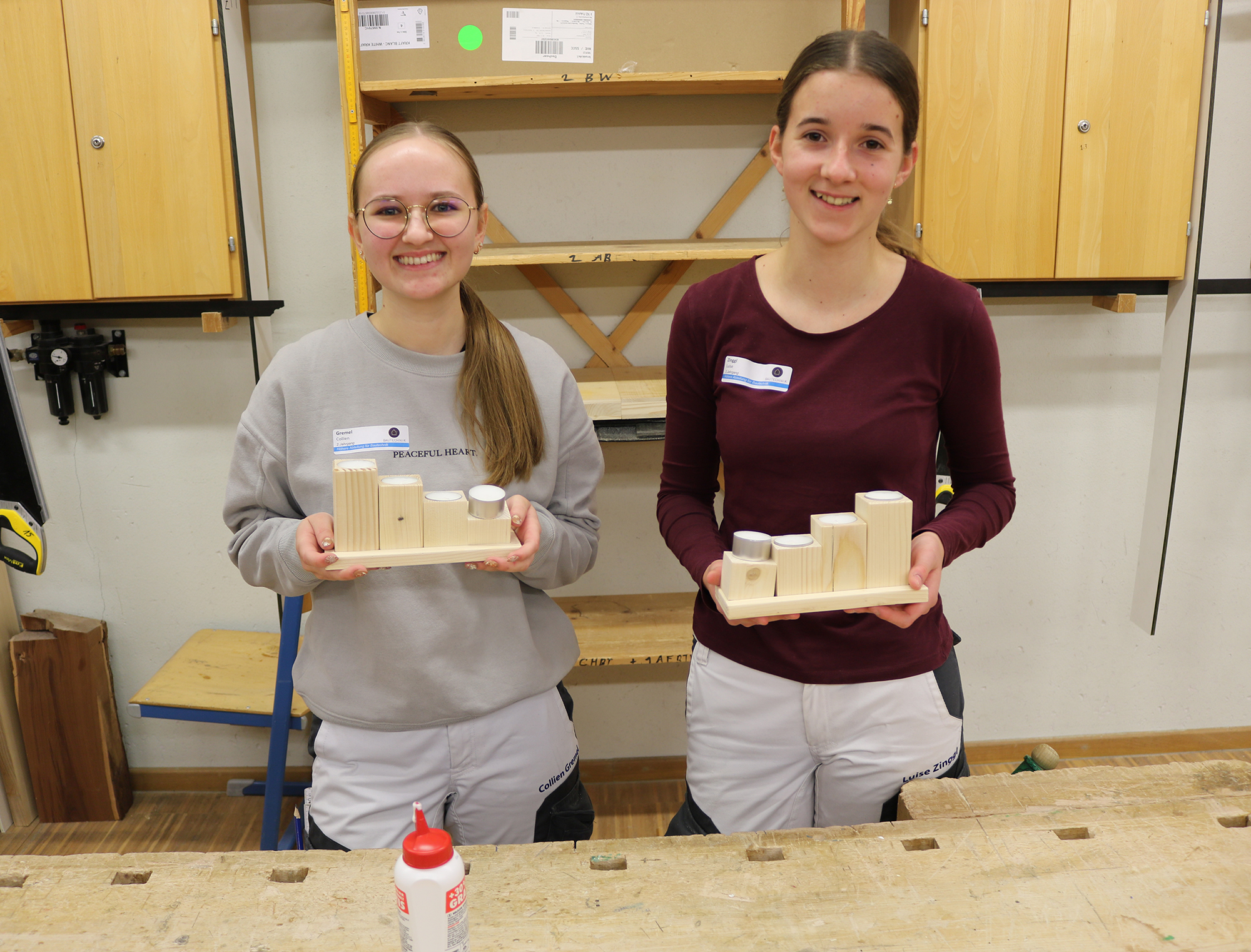 So wurden die verschiedenen Aspekte des Unterrichts anhand der Gegenstände und von Diplomarbeiten erläutert. Im Baulabor wurden Holz- und Betonversuche durchgeführt, die Zukunft des virtuellen Bauens wurde mittels VR-Brille sowie 3D-Scannen und -Drucken demonstriert. Die Wärmebildkamera zeigte am Modellhaus sehr anschaulich potentielle Schwachstellen. Wesentliche Teile des fachpraktischen Unterrichts in der Zimmerei und Maurerei konnten am Ende des Rundgangs selbst ausprobiert werden.