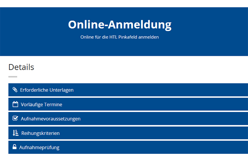Weitere Informationen wie erforderliche Unterlagen, vorläufige Termine, Aufnahmevoraussetzungen und Reihungskriterien können auf https://www.htlpinkafeld.at/schule/aufnahme/ nachgelesen werden.