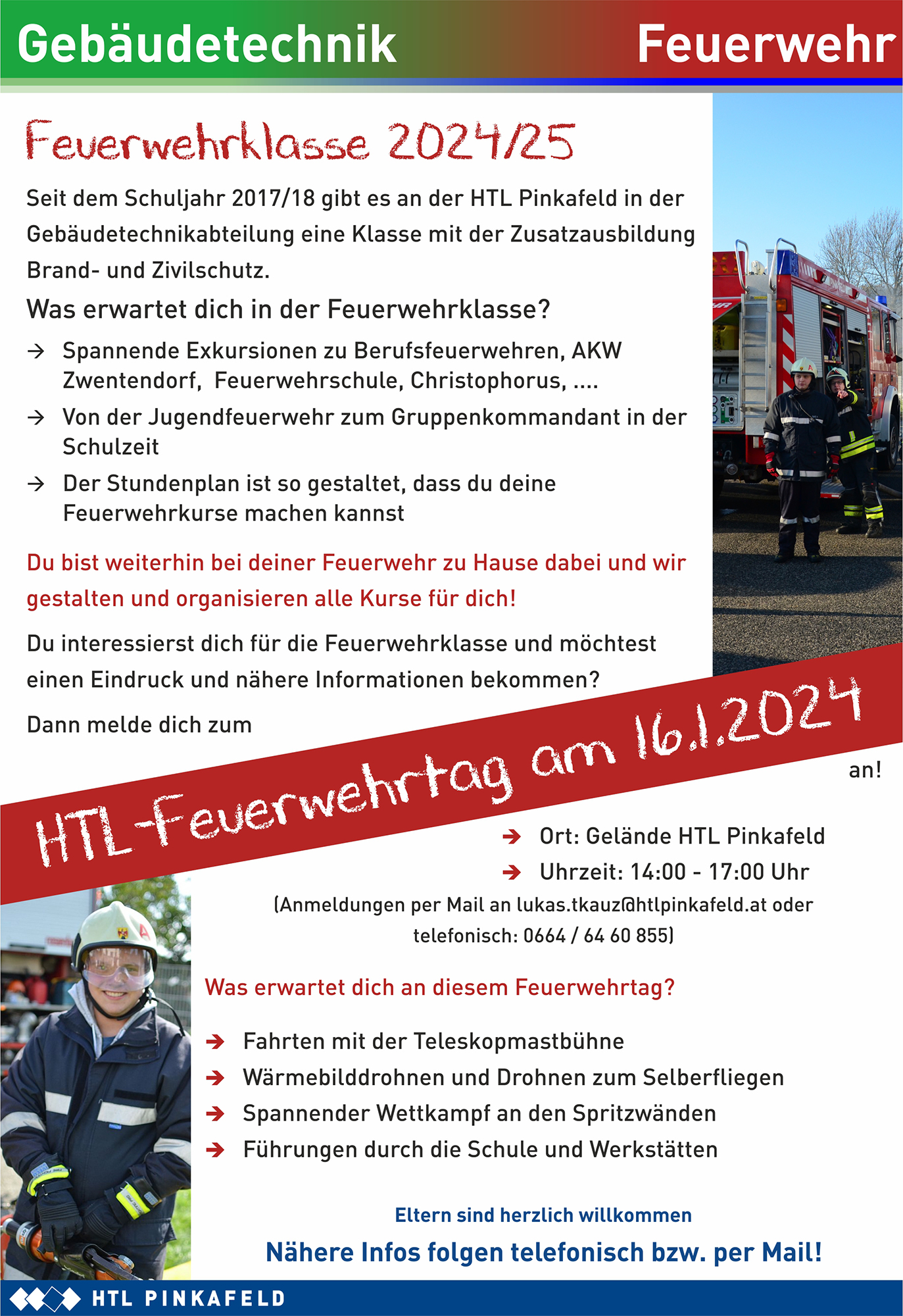 Dann komm zum „Feuerwehrtag“ am Dienstag, 16. Jänner 2024, von 14 bis 17 Uhr – Anmeldung unter lukas.tkauz@htlpinkafeld oder 0664 / 6460855.