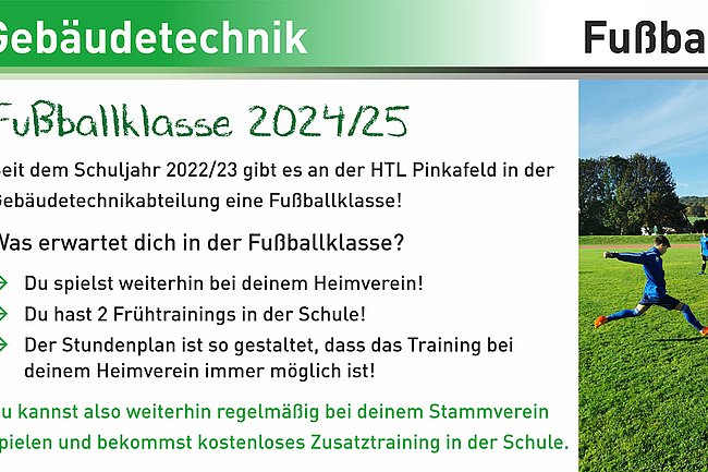 Auch im kommenden Schuljahr startet wieder eine Fußball-Klasse in der Gebäudetechnik-Abteilung. Dort ist der Stundenplan so gestaltet, dass das Training beim Heimatverein immer möglich ist und mit zusätzlichen Frühtrainings und weiteren Aktivitäten die fußballerische Entwicklung gefördert wird.