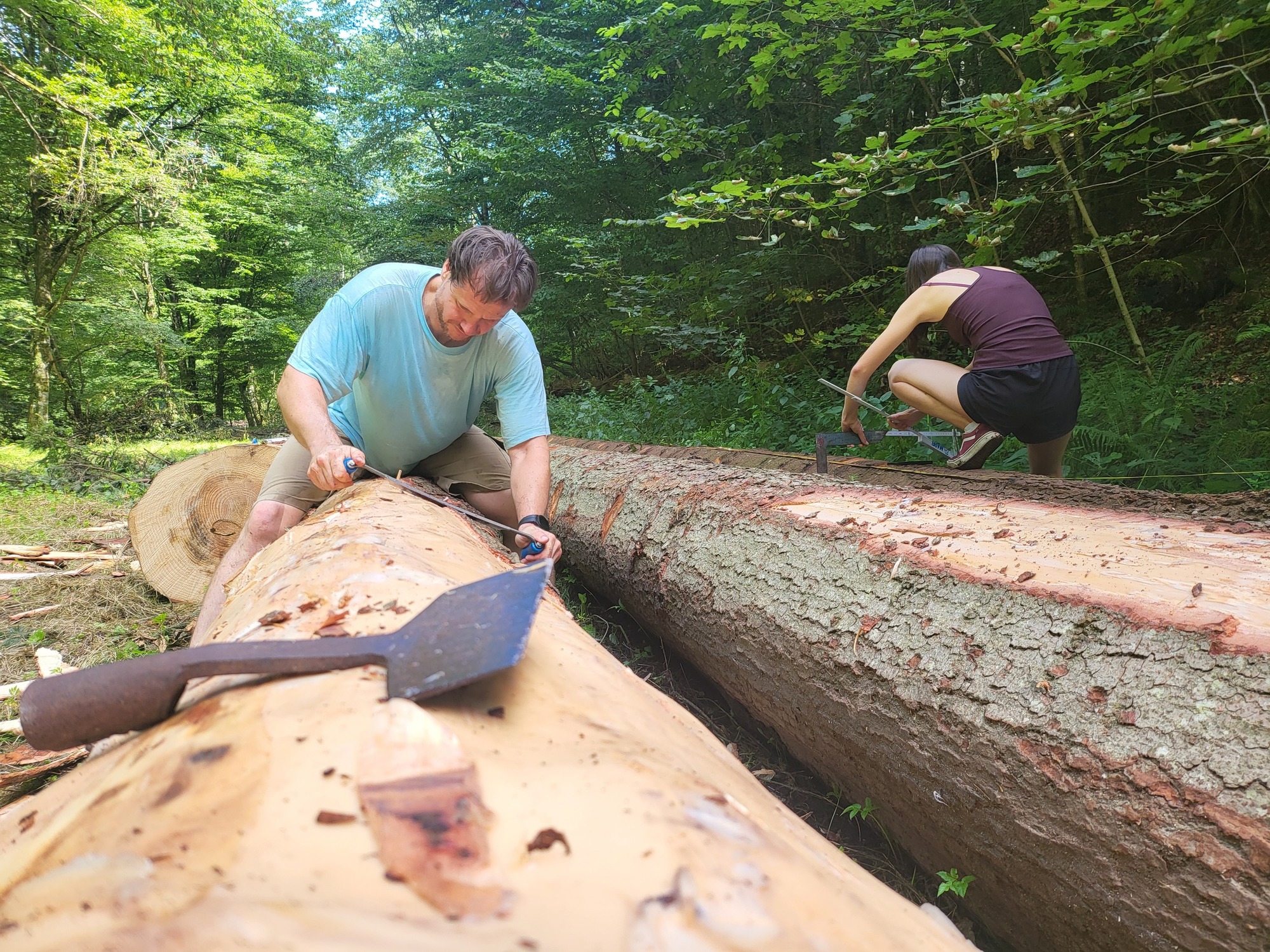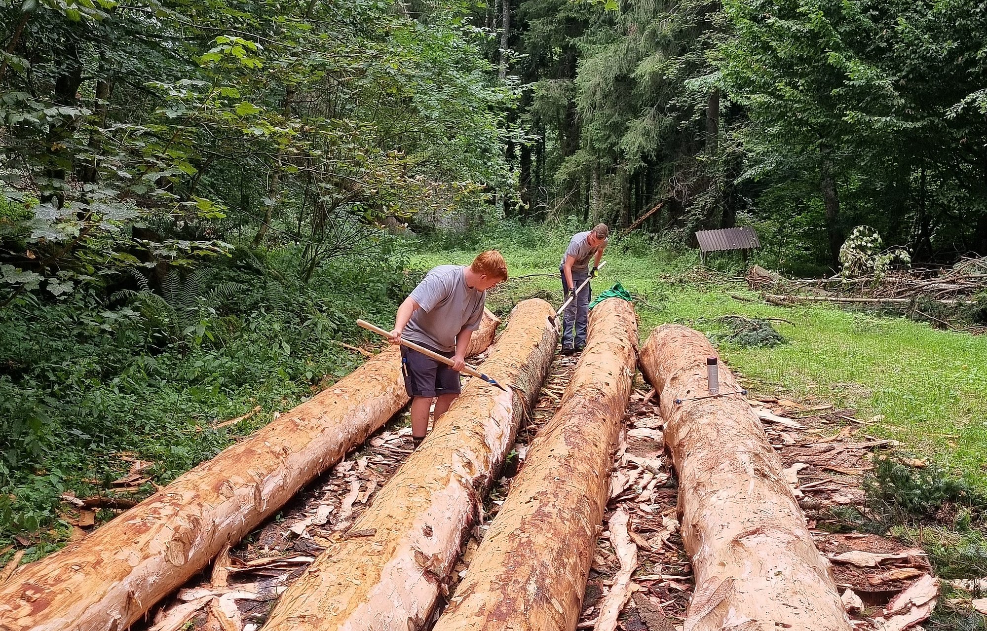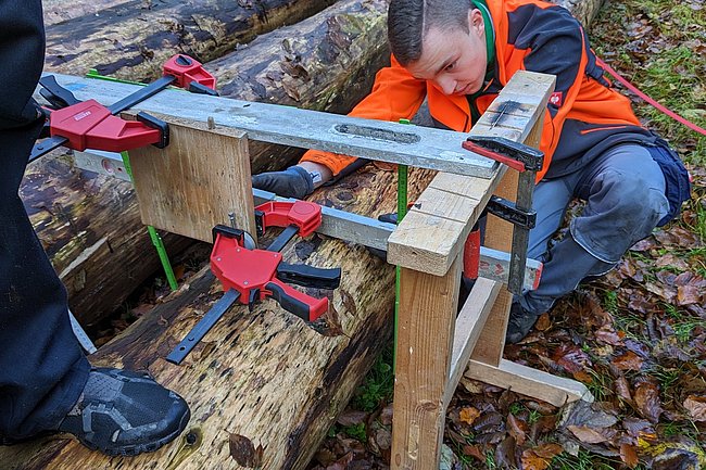 Danach begab man sich auf die Suche nach fünf geeigneten Bäumen, die schließlich gefällt, entrindet und vermessen wurden. Zur Feststellung des E-Moduls erfolgte ein Biegeversuch vor Ort. Parallel dazu arbeiten die Schüler*innen an der Einreichplanung bzw. Modellierung mit der Finite Elemente Methode.
