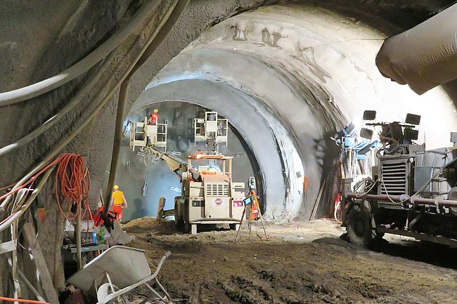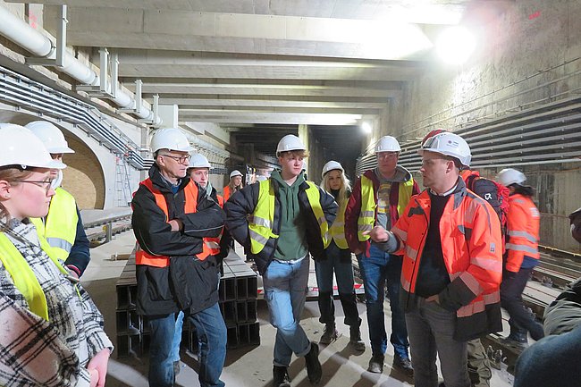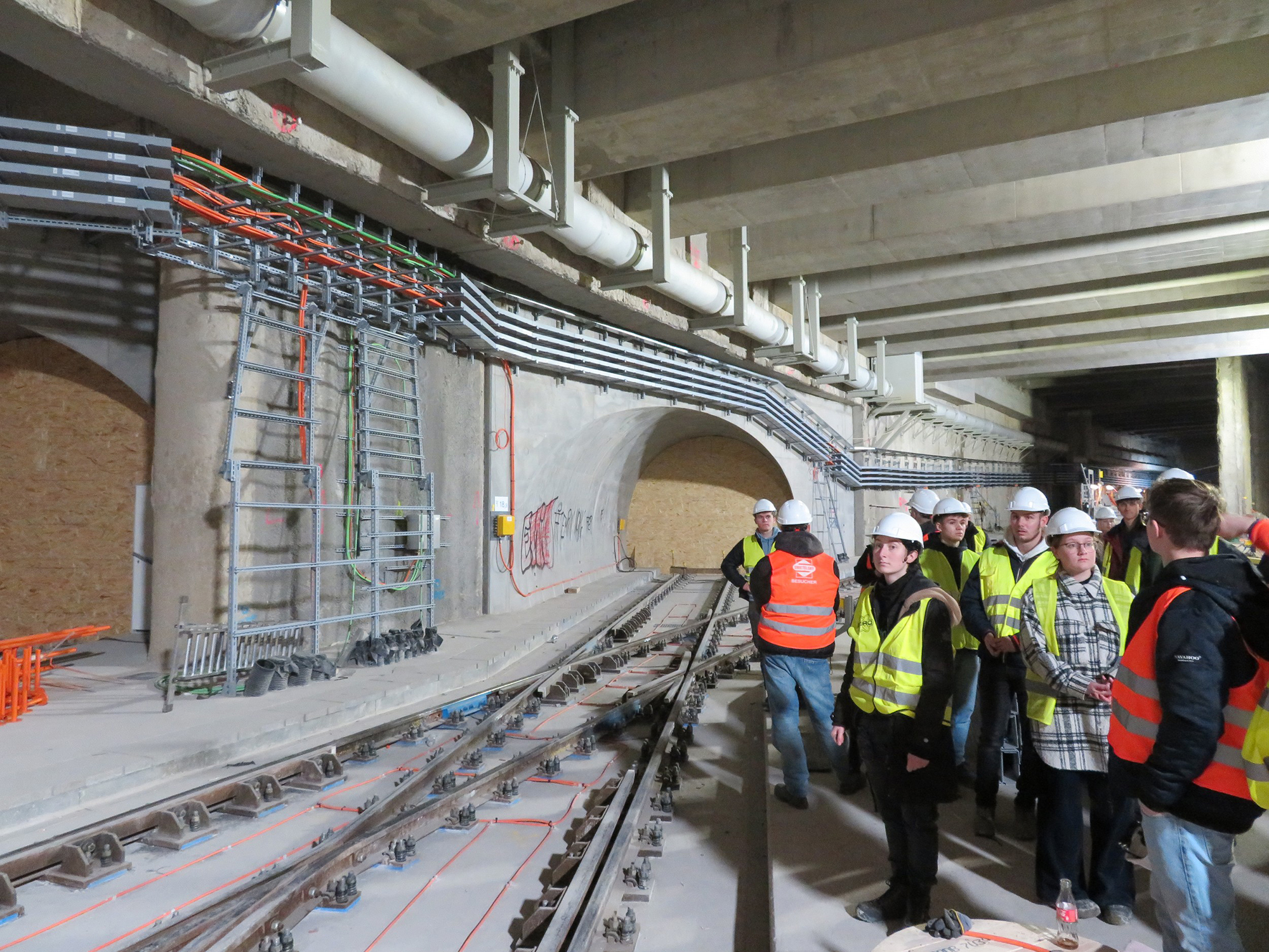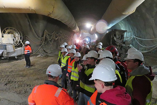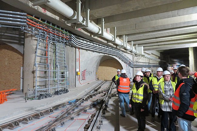Mitte Februar hatten die Bautechnik-Schülerinnen und -Schüler der 5YHBTT/B die Möglichkeit, gemeinsam mit ihren Professoren Peter Derler und Hans Glatz die aktuelle U-Bahn-Baustelle Linienkreuz U5xU2 in Wien zu besichtigen. Ausgehend vom Schacht am Friedrich-Schmidt-Platz beim Wiener Rathaus, welcher später als U-Bahn-Station verwendet wird, wurden verschiedene Tunnelröhrenabschnitte begangen. Dabei konnten die im Unterricht erlernten Themen wie beispielsweise Tunnelvortrieb in NÖT-Bauweise, Voraussicherungsmaßnahmen mittels Spieße oder DSV-Schirm sowie auch die Herstellung der Tunnelinnenschale mittels Schalwagen hautnah erlebt werden. Besonders interessant war auch der Übergang zur Bestandsstrecke der Linie U2, wo die längsten Großbohrpfähle Wiens – mit einer Länge von über 60 Meter – direkt neben der Universität Wien abgeteuft wurden.
