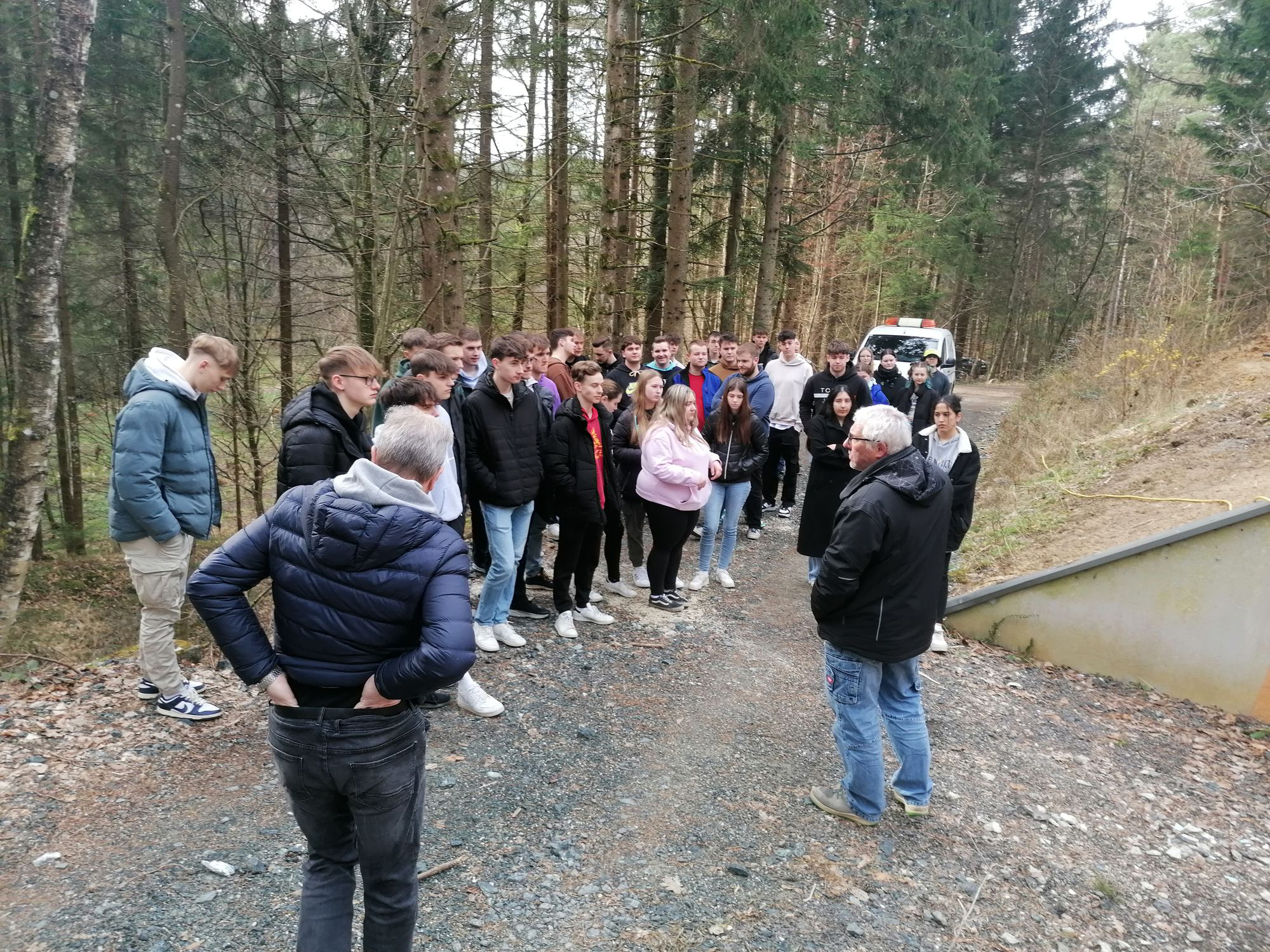 Im Anschluss daran begab sich die Gruppe zur Quellfassung Karleck. Die Quellfassung Karleck wurde im Jahr 2023 komplett neu saniert und die Quellen neu gefasst. Herr Szendi führte die Schüler durch das Gelände und erklärte die Maßnahmen zum Schutz der Wasserressourcen sowie die Bedeutung der nachhaltigen Nutzung von Wasserquellen.