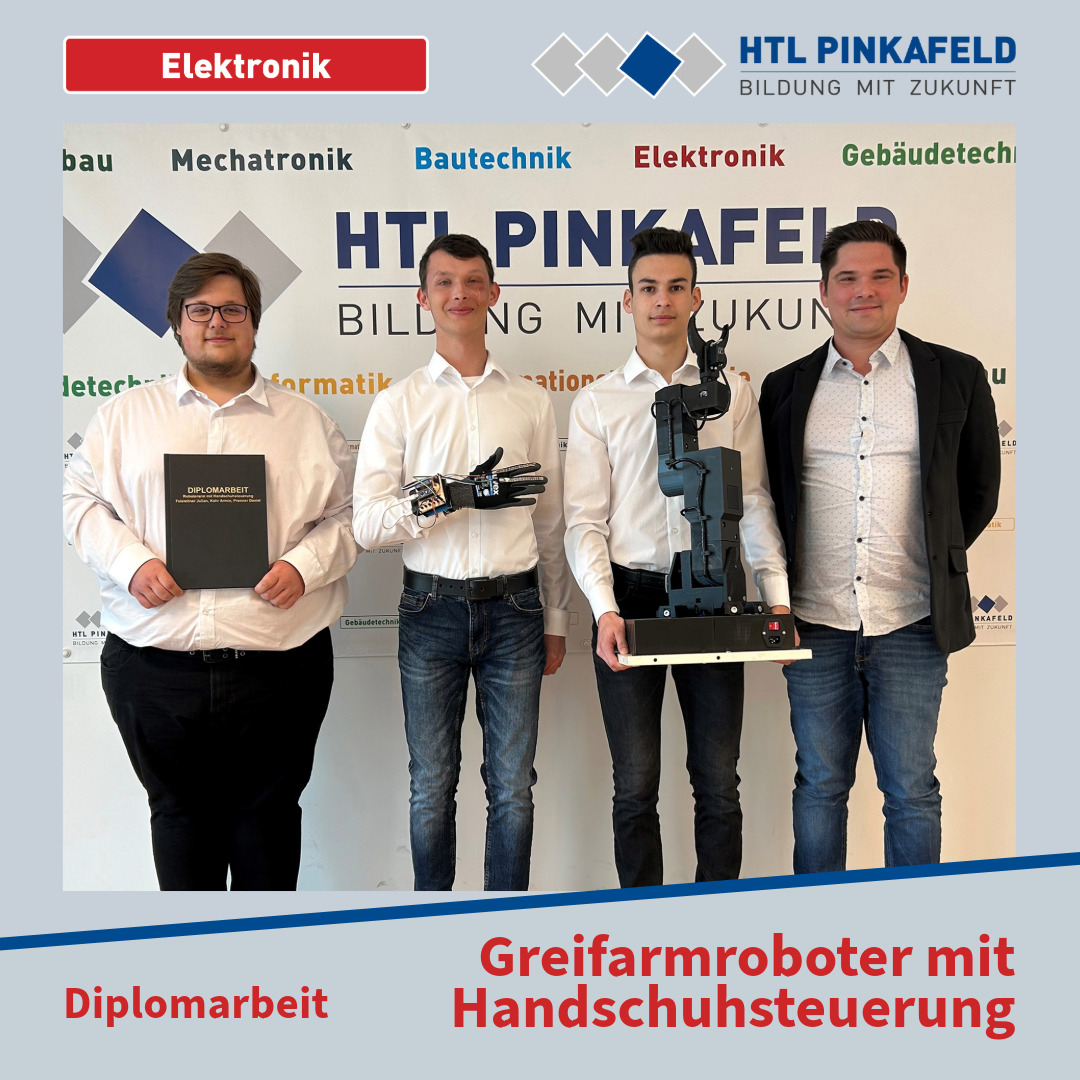 Anfang April wurde die Elektronik-Diplomarbeit „Greifarmroboter mit Handschuhsteuerung“ von den Maturanten Armin Kahr, Daniel Prenner und Julian Felsleitner an den Auftraggeber HTL Pinkafeld übergeben. Betreut wurde diese Diplomarbeit von Prof. Christian Josef Paar.