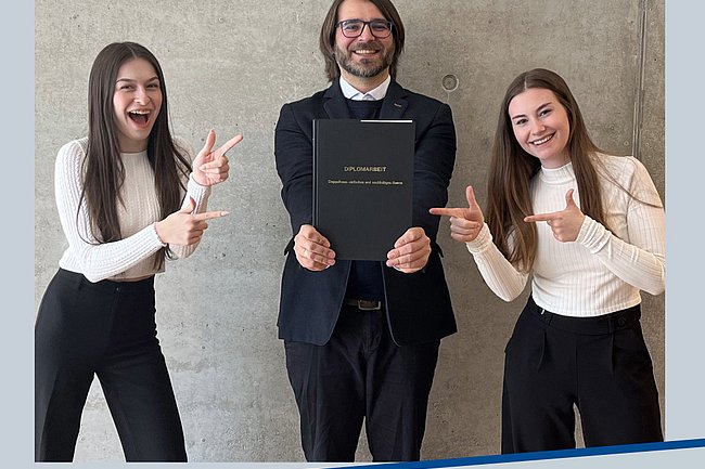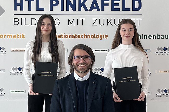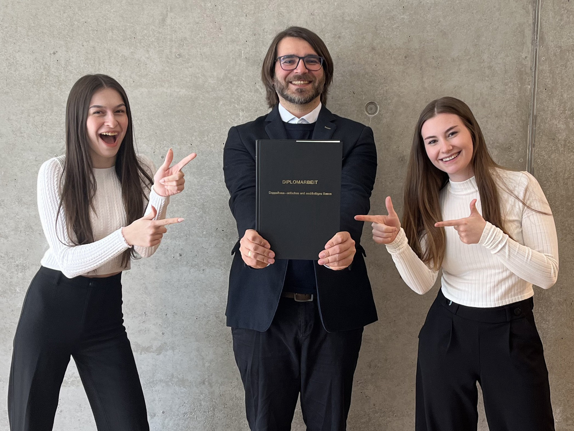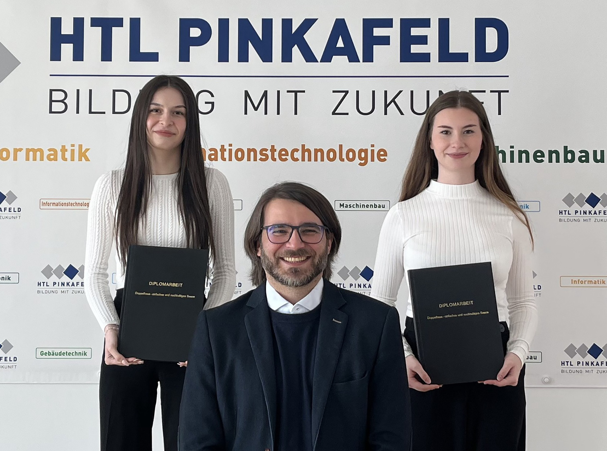 Die Bautechnik-Maturantinnen Chava Gichkayeva und Elena Lutzmann übergaben Mitte Apil ihre Diplomarbeit ihrem Diplomarbeitsbetreuer Prof. Christoph Schermann übergeben.