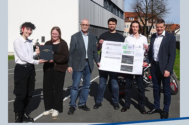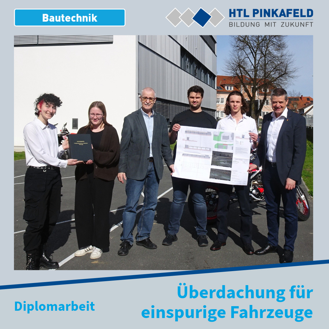 Die Bautechnik-Diplomarbeit zur Errichtung eines Zweiradabstellplatzes für die HTL Pinkafeld wurde kürzlich abgeschlossen und dem Auftraggeber Direktor Wilfried Lercher sowie dem Diplomarbeitsbetreuer OStR Peter Derler übergeben.