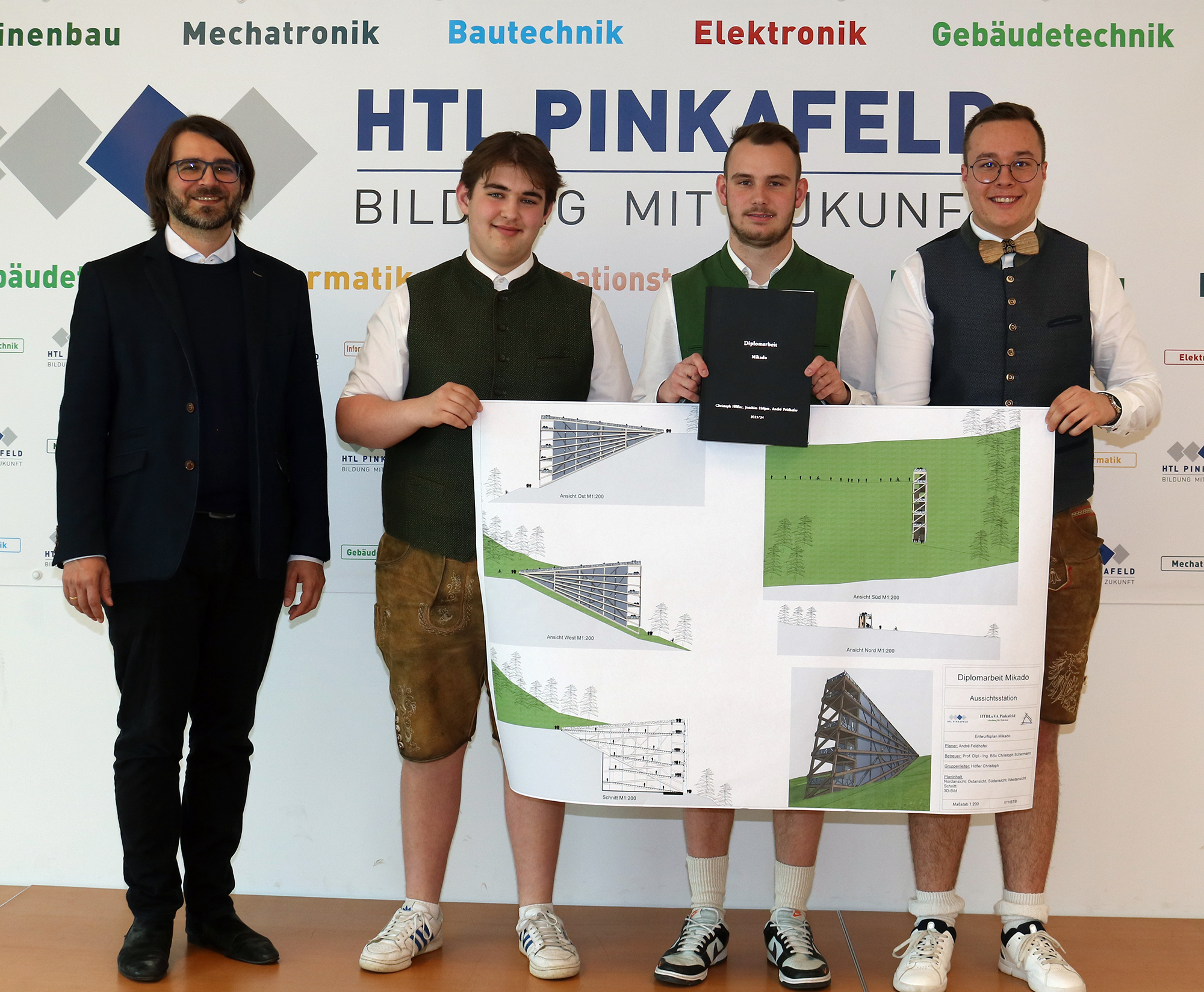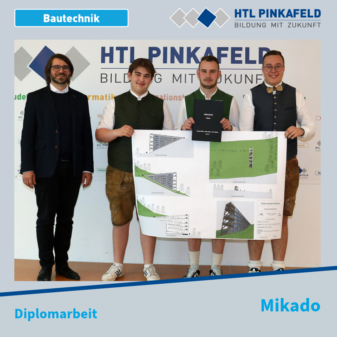 Nach intensiven Wochen der Projektbearbeitung wurde Mitte April die Diplomarbeit „Mikado“ von den Bautechnik-Maturanten Christoph Höfler, Joachim Halper und Andre Feldhofer, Ausbildungsschwerpunkt Holzbau, an ihren Betreuungslehre Prof. Christoph Schermann übergeben.