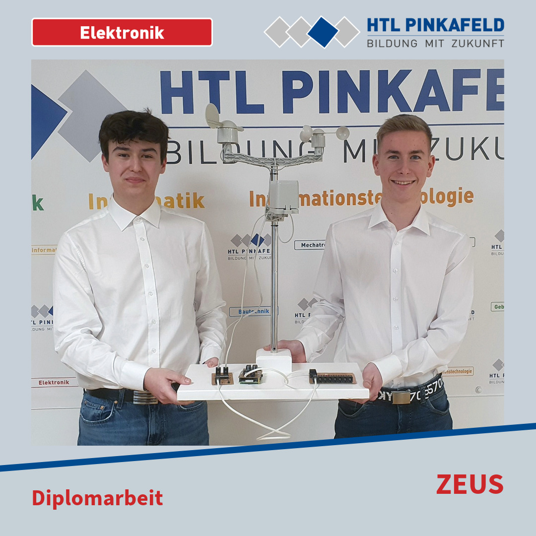 Im April wurde die Diplomarbeit „ZEUS“ von den Elektronik-Maturanten Matthias Mandler und Florian Weber an den Auftraggeber HTL Pinkafeld übergeben. Betreut wurde diese Diplomarbeit von Prof. Dietmar Scheiblhofer.