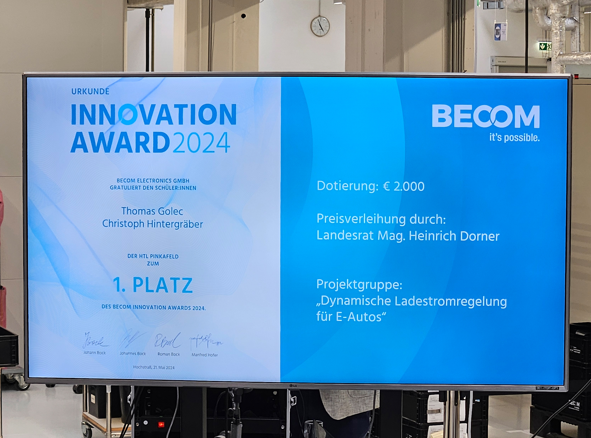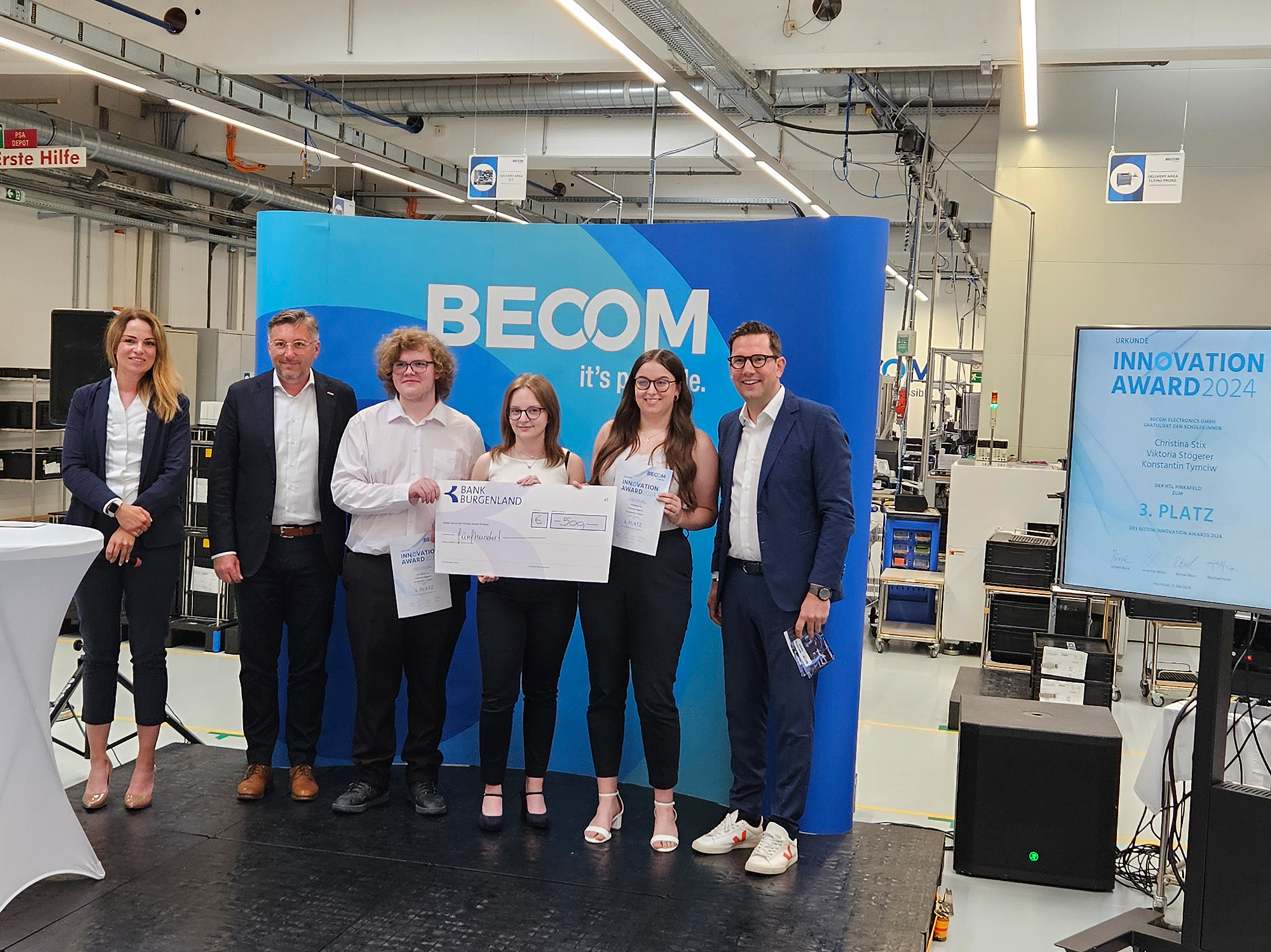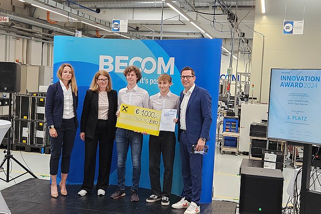 Am 22. Mai 2024 holte die im burgenländischen Hochstraß ansässige „BECOM Electronics GmbH“, langjähriger Bildungspartner der Abt. Elektronik und Technische Informatik, mit dem „Innovation Award 2024“ wieder herausragende Elektronik-Diplomarbeiten vor den Vorhang. In einem mehrstufigen Prozess wurden die innovativsten Projekte begutachtet und gereiht. Vor hochrangigen Vertretern von Industrie und Wirtschaft überreichte Landesrat Heinrich Dorner schließlich den mit € 2.000 dotierten ersten Preis an das Team „Dynamische Ladestromregelung für E-Autos“.
