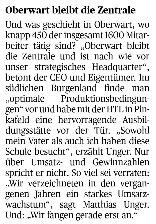 Ing. Mag. (FH) Matthias Unger, CEO und Eigentürmer von „Unger Steel“ sowie Präsident des Fördervereins „HTL PLUS – Bautechnik“ gab in der Mittwochausgabe von „Die Presse“ ein Interview über die Kooperation mit dem US-Baukonzern Bechtel. Darin bestätigte er, dass Oberwart die Zentrale und das strategische Headquartier bleibt und verwies u.a. auf die „hervorragende Ausbildungsstätte vor der Tür“, die er selbst und auch bereits sein Vater besucht haben.