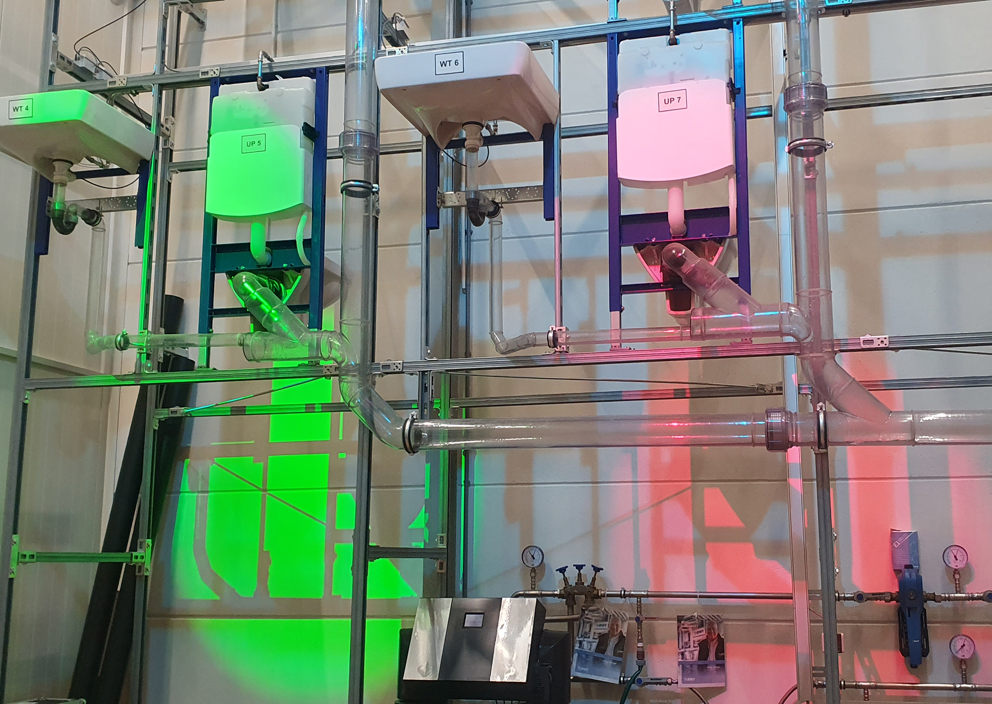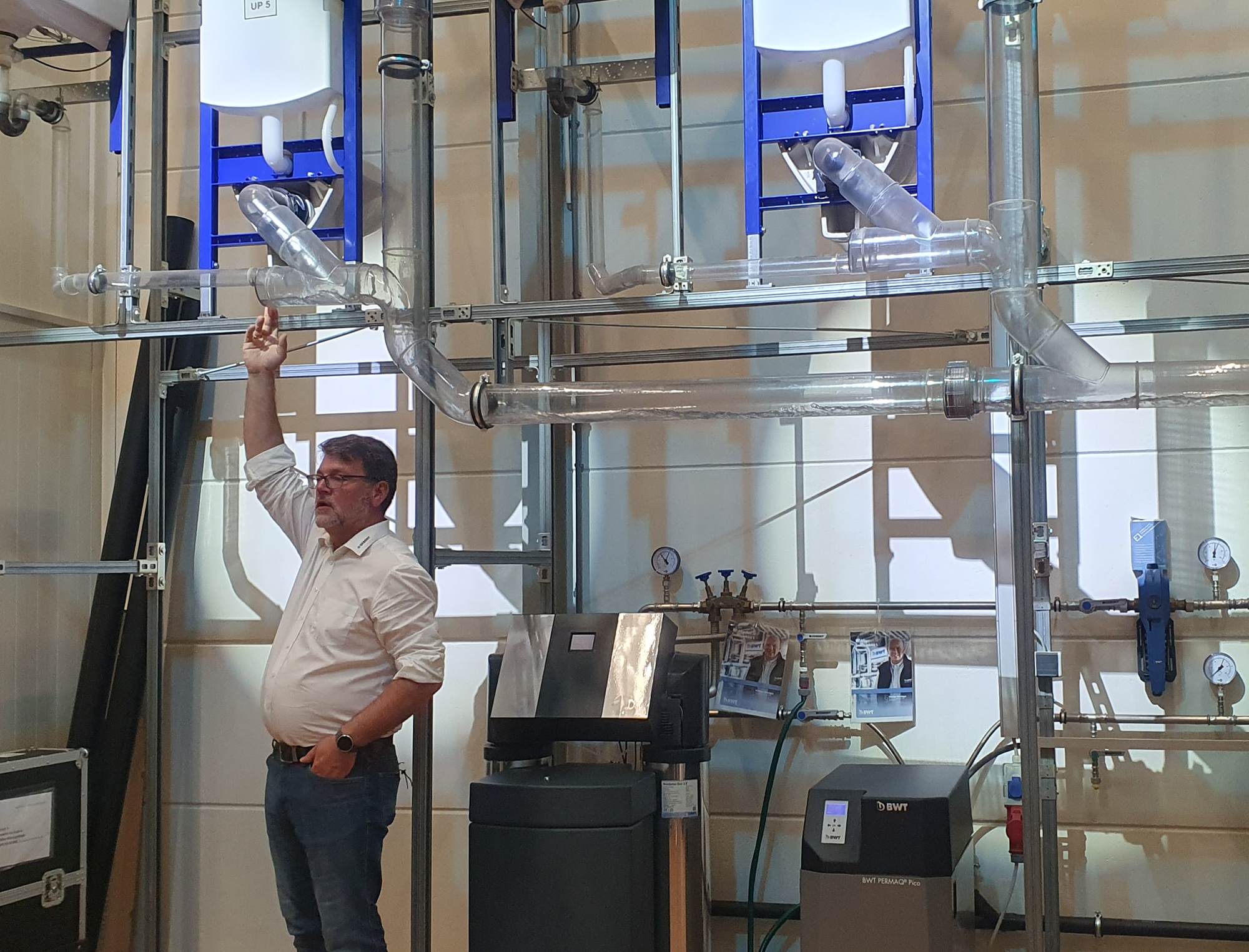 Nach dem Mittagessen wurden wichtige Planungsgrundlagen in Hinsicht Trinkwasserhygiene, Schallschutz und Brandschutz in der Sanitärtechnik und Verlegerichtlinien in der Abwassertechnik besprochen. Abschließend wurde der Abwasserturm besichtigt, wo Fehler in der Verlegung von Abwasserleitungen veranschaulicht und bewusst gemacht wurden. Abgerundet haben das Programm einige Anekdoten aus dem Erfahrungsschatz von Harald Hofko, der dadurch sehr lebendig sein Know How vermitteln konnte.
