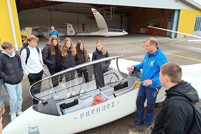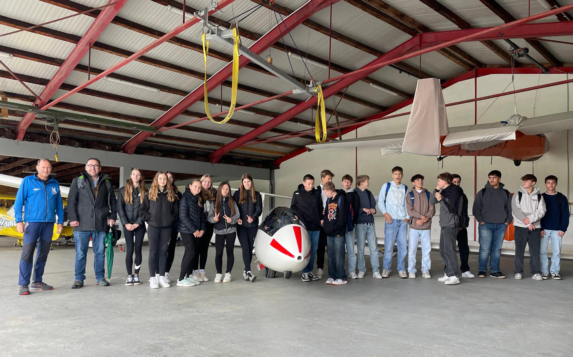 Als Kontrastprogramm erwies sich anschließend die sehr spannende Führung von Pilotentrainer Christian Lechner über das Angebot des Sportfliegerclubs am Pinkafelder Flugplatz – Segelflugmaschinen, Sportmaschinen und moderne Doppeldecker konnten dabei kennengelernt und sogar darin probegesessen werden. Den Schülerinnen und Schülern wurde dabei auch der praktische Physikunterricht im Bereich der Aerodynamik der Maschinen anhand von Praxisbeispielen nähergebracht.