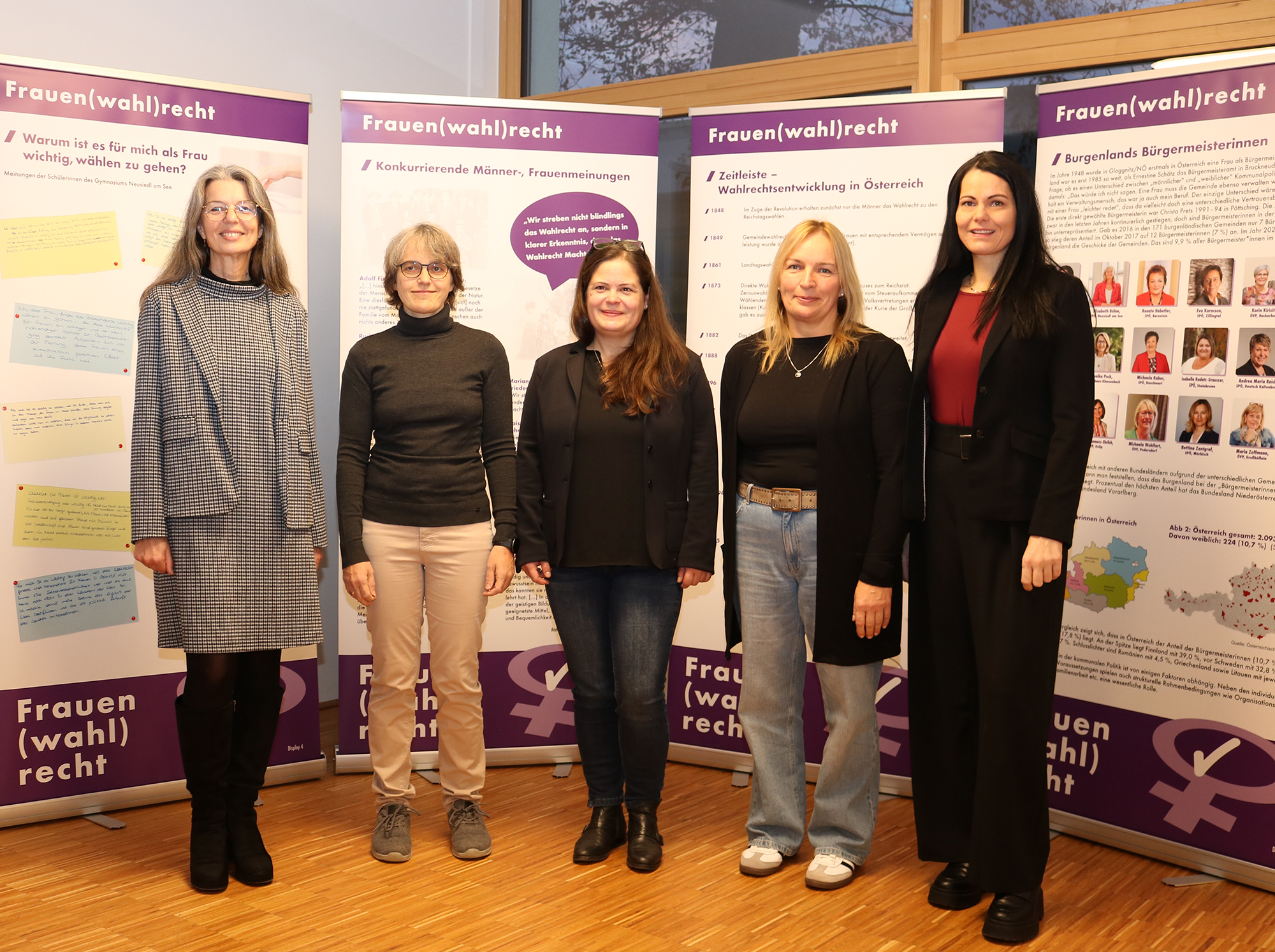 Mitte Dezember eröffnete SQM Daniel Baumann gemeinsam mit Dir. Wilfried Lercher, den zwei Abteilungsvorständinnen Ulrike Hartler und Barbara Rehling und mehreren Professorinnen der HTL Pinkafeld die im Eingangsfoyer bis Mitte Jänner platzierte Wanderausstellung „Frauen(wahl)recht - Frau & Politik im Burgenland“. Sie dokumentiert die Geschichte des Frauenwahlrechts in Österreich und wurde aufgrund des 100-jährigen Jubiläums 2018 vom Land Burgenland initiiert.