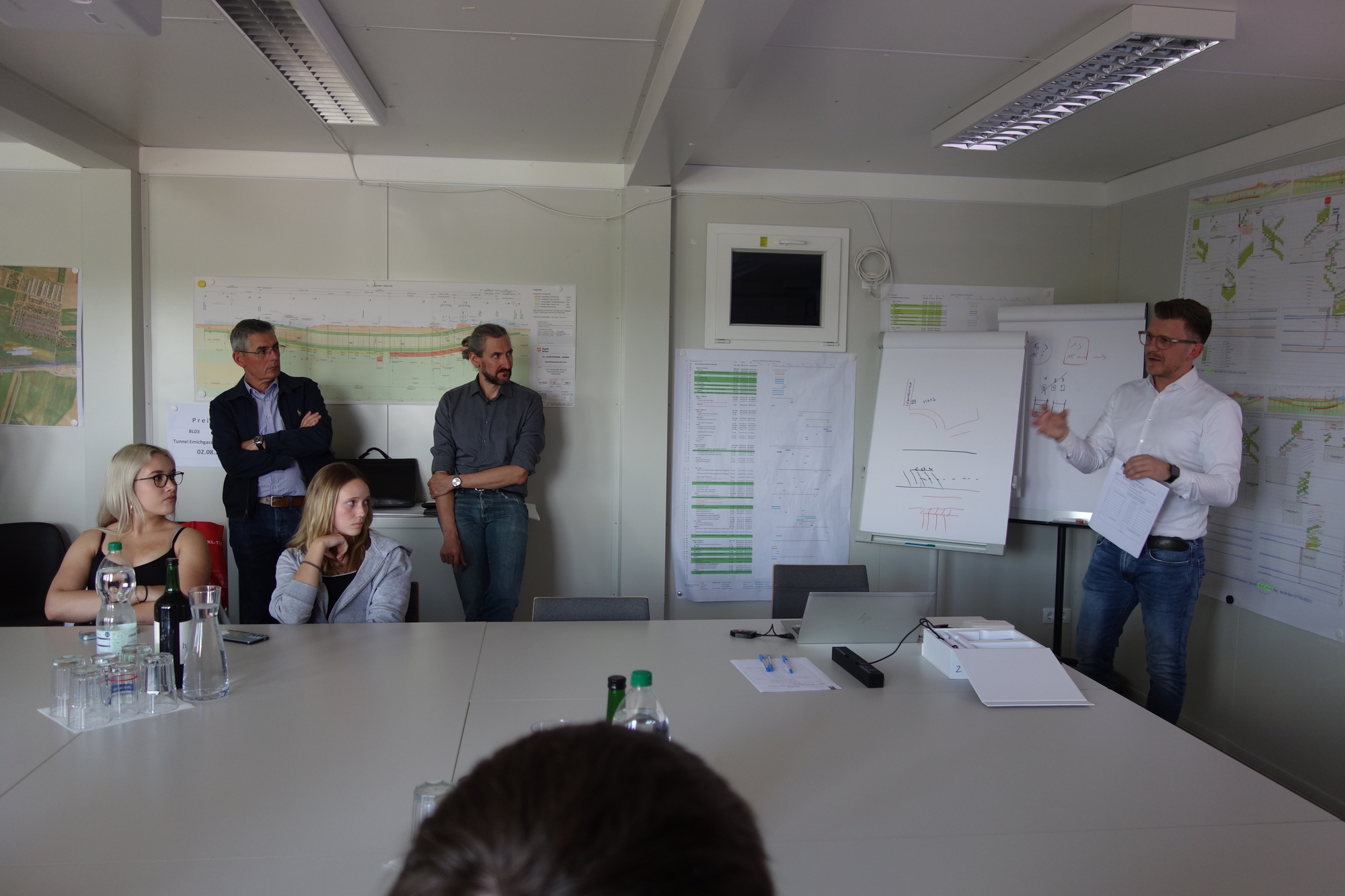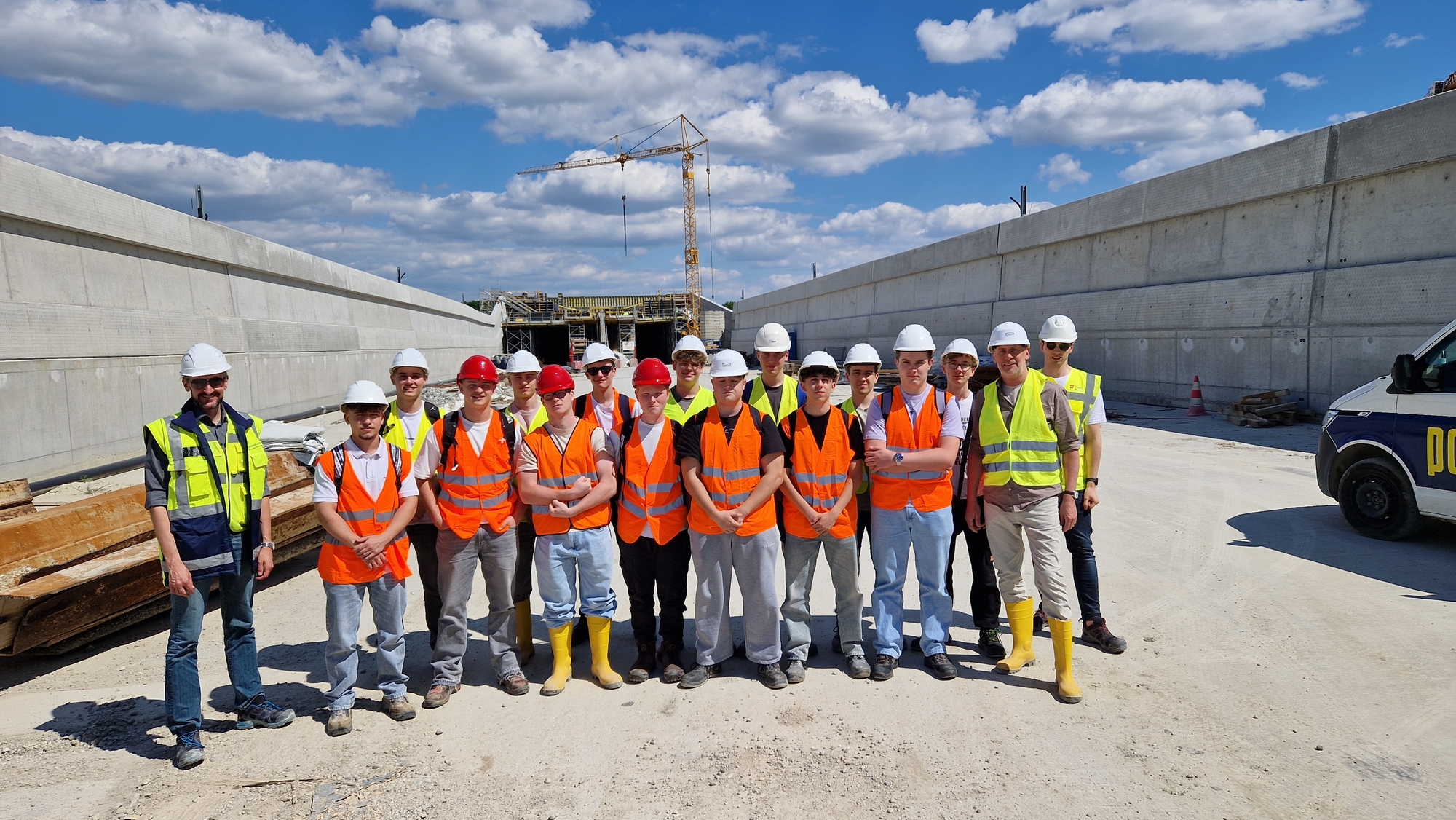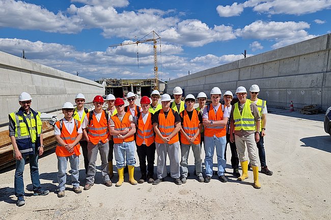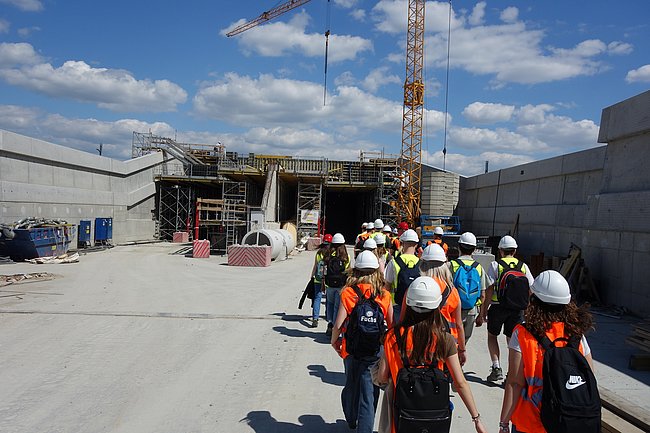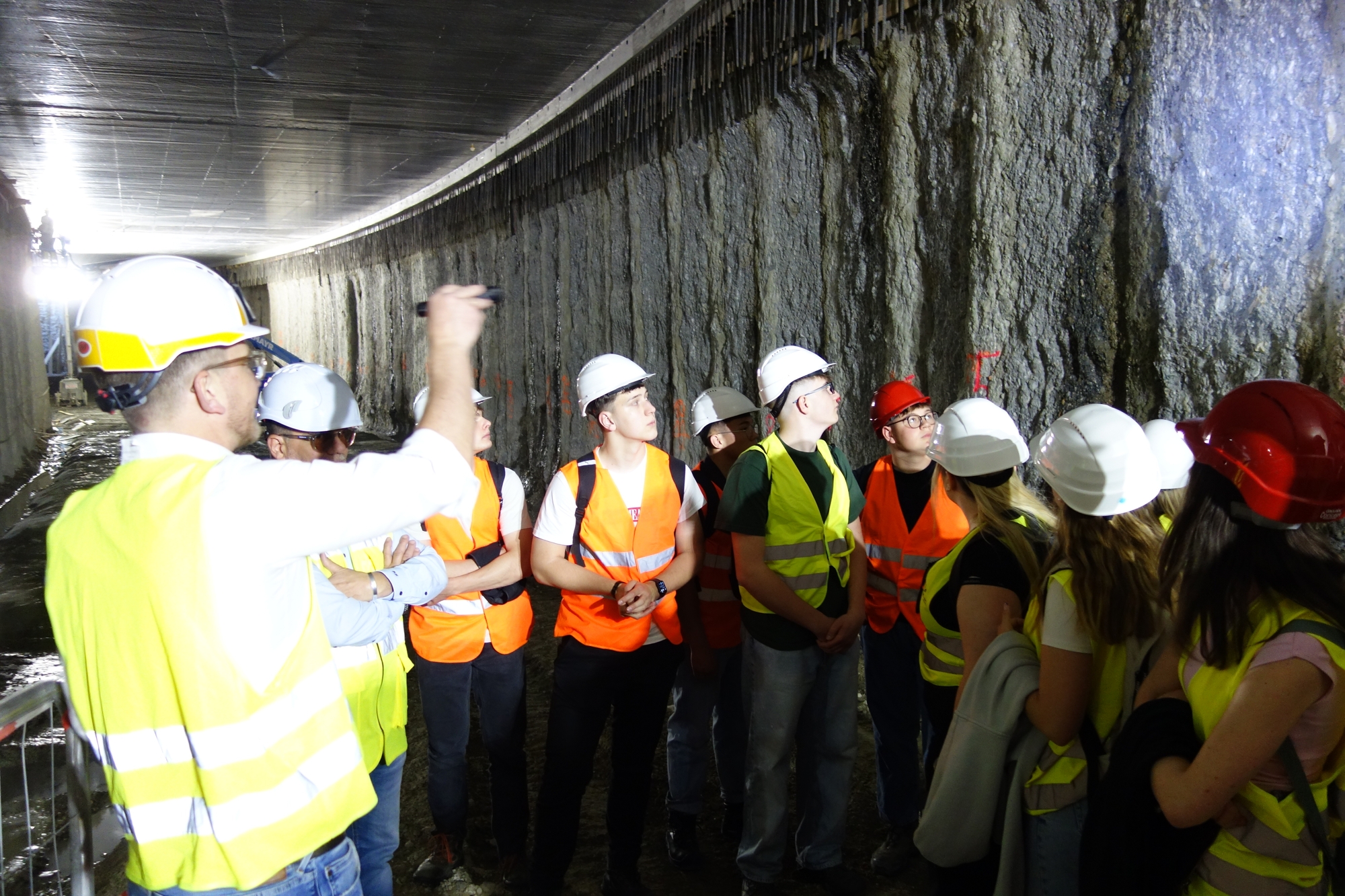Die zweite Station führte die Schüler:innen in den Nordosten von Wien, zur Seestadt Aspern, wo derzeit an der Errichtung der Stadtstraße gearbeitet wird. Nach einer interessanten Einführung über die erforderlichen Behördenverfahren, den Widerstand von Projektkritiker:innen, die Planung und die aktuellen technischen Herausforderungen der Umsetzung konnten die Schüler:innen die Tunnelabschnitte besichtigen und ihr theoretisches Wissen durch praktische Erfahrungen festigen.
