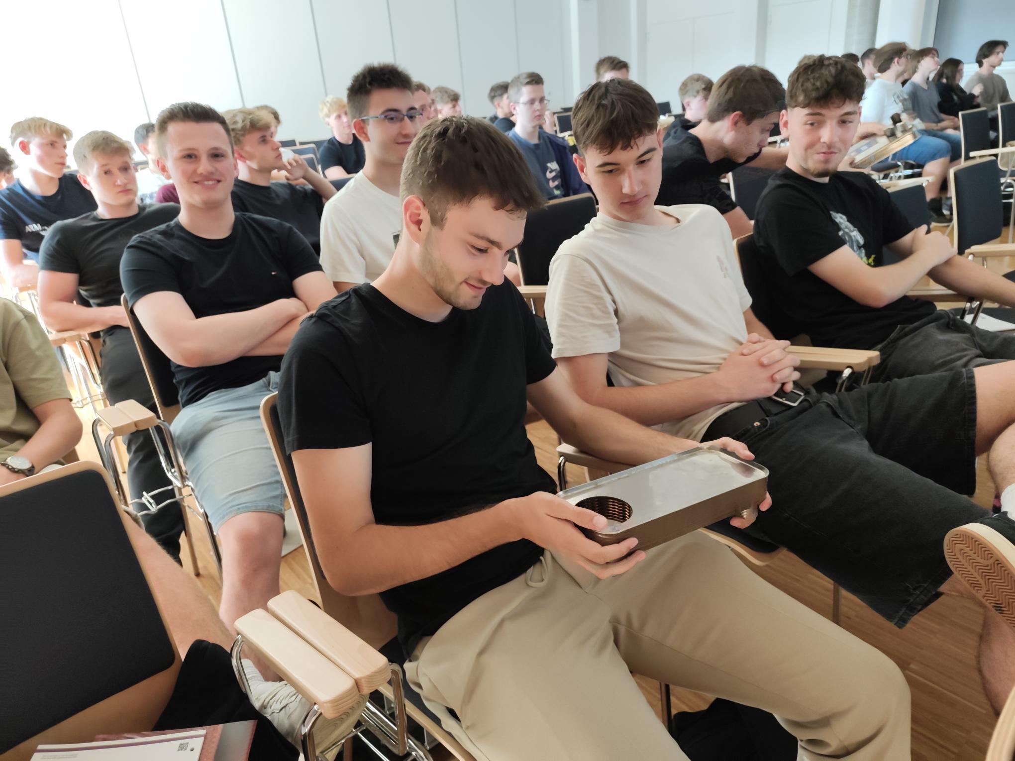 Im Zug des Laborunterrichts gewährte Herr Marton exklusive Einblicke in die Welt der industriellen Wärmetauscher – von den Grundlagen der Thermodynamik bis hin zu modernen Anwendungen in der Energie- und Verfahrenstechnik. Besonders beeindruckend waren die mitgebrachten hauchdünnen Wärmetauscherplatten und Schnittmodelle, sowie eine Kalkplatte, welche aufgrund von Anbackungen in einem Wärmetauscher entstand. Mit realen Praxisbeispielen zeigte Herr Marton auf, wie wichtig der Zusammenhang der Wärmetauscherplatten und dem Druckverlust ist und lenkte so den Fokus auf Nachhaltigkeit und Effizienz in der Wärmerückgewinnung.