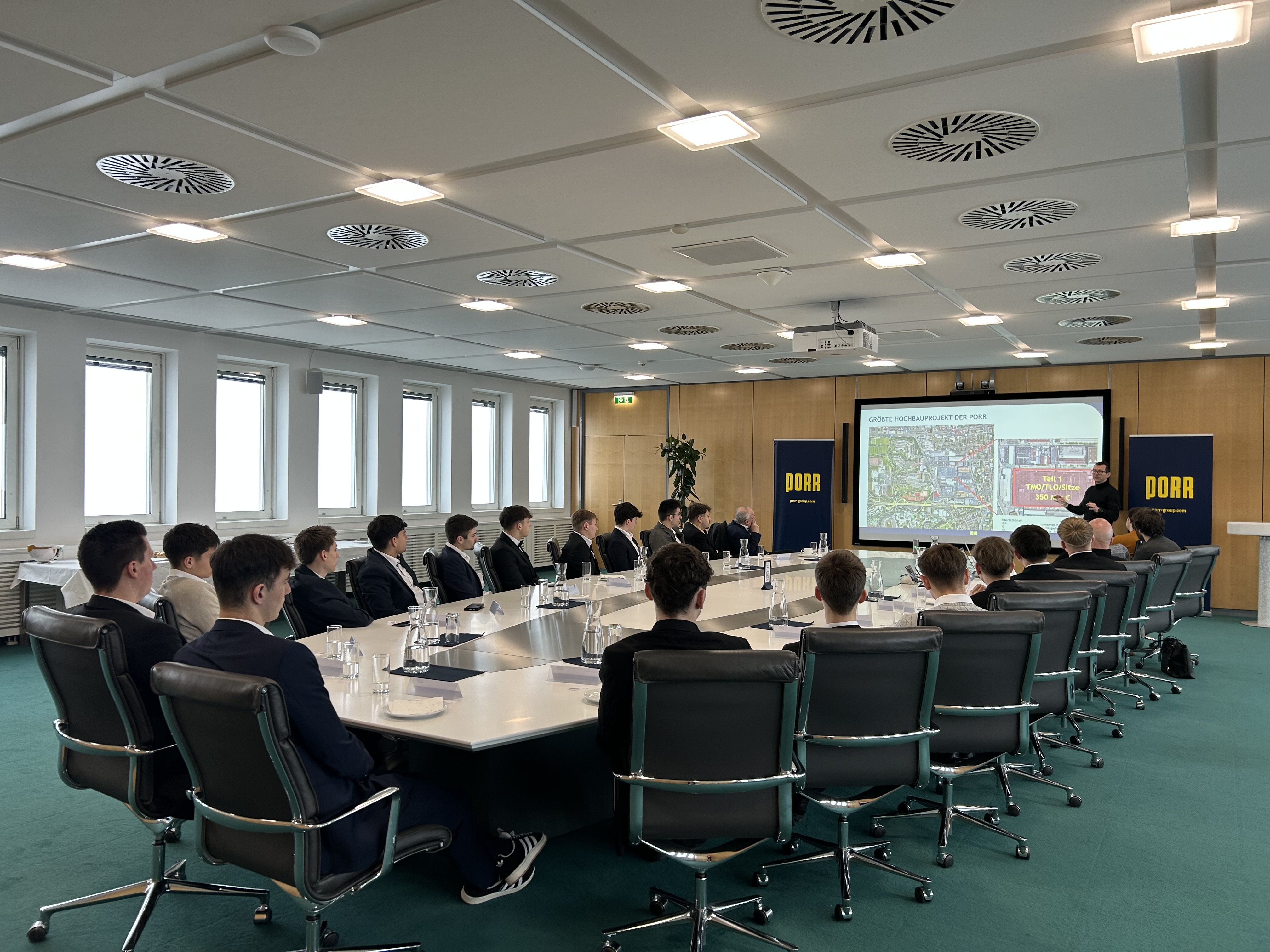 Der erste Stopp führte in den 20. Stock der Zentrale der Firma PORR, wo u.a. DI Gernot Wagner, Geschäftsführer und Absolvent der HTL Pinkafeld, über aktuelle BIM-Projekte sowie Karrieremöglichkeiten informierte.