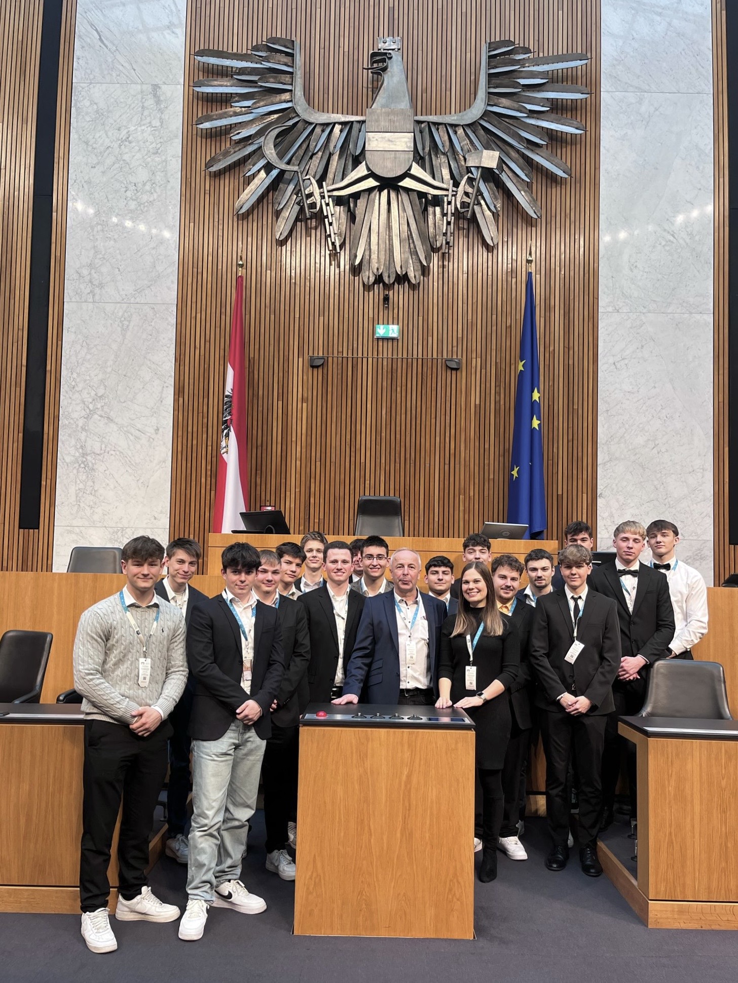 Nach einem Besuch der „Skylobby“ und einem gemeinsamen Mittagessen vor Ort ging es weiter zum Wiener Parlament. Dort erwartete die Schüler nicht nur eine informative Führung durch das imposante Gebäude, sondern auch ein exklusiver Blick hinter die Kulissen – mit besonderem Fokus auf die Haustechnik, die in ihrer Größe und Komplexität große Faszination hervorrief.