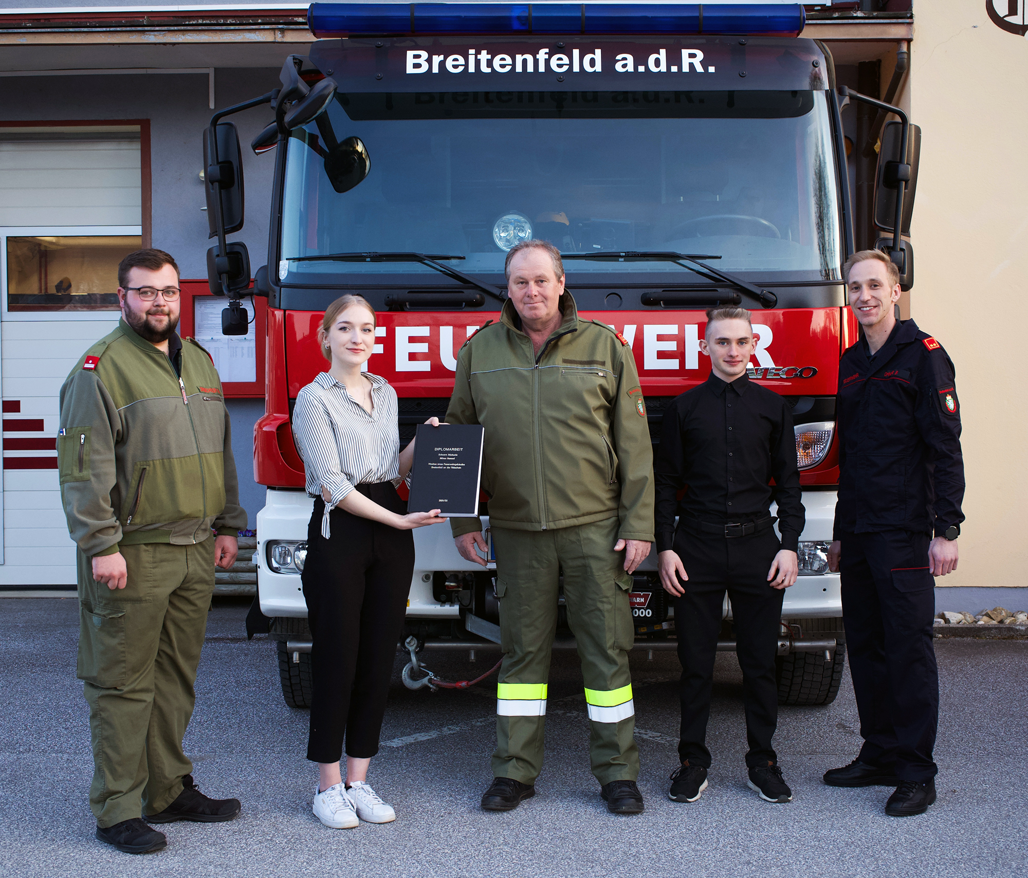 Der Ortsteil Breitenfeld an der Rittschein in der Gemeinde Riegersburg beabsichtigt ein neues Feuerwehrhaus zu errichten, da das alte Gebäude in der Ortsmitte keine Erweiterung erlaubt. Die Bautechnik-Maturanten Michaela Schwarz und Samuel Mirna hatten im Rahmen ihrer Diplomarbeit für die Neuplanung außerhalb des Ortes einige Besprechungen mit den Mitgliedern der örtlichen Feuerwehr HBI Florian Brandl, OBI Gerhard Heschl, BM Benjamin Ohner und LM Thomas Urschler.