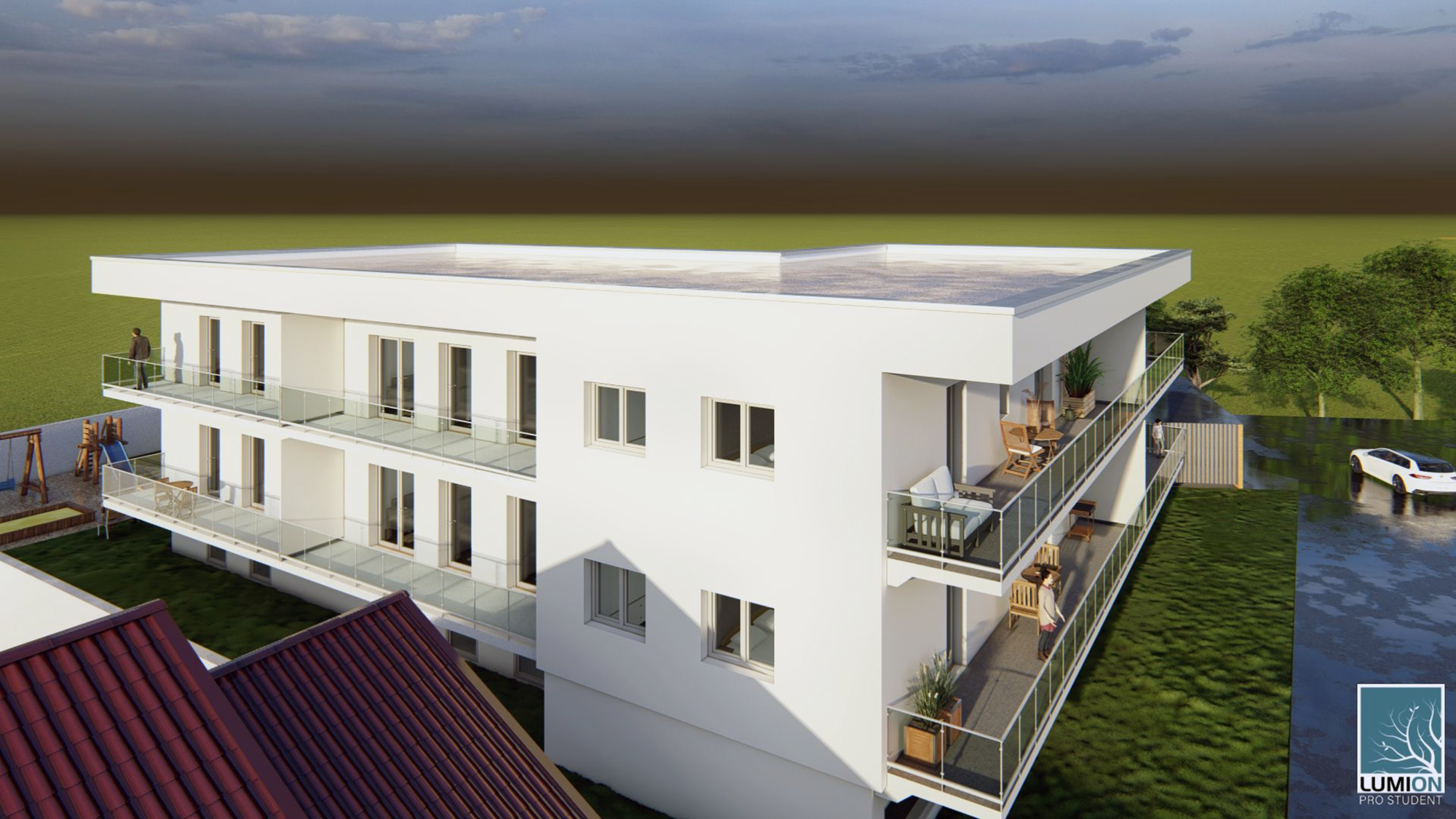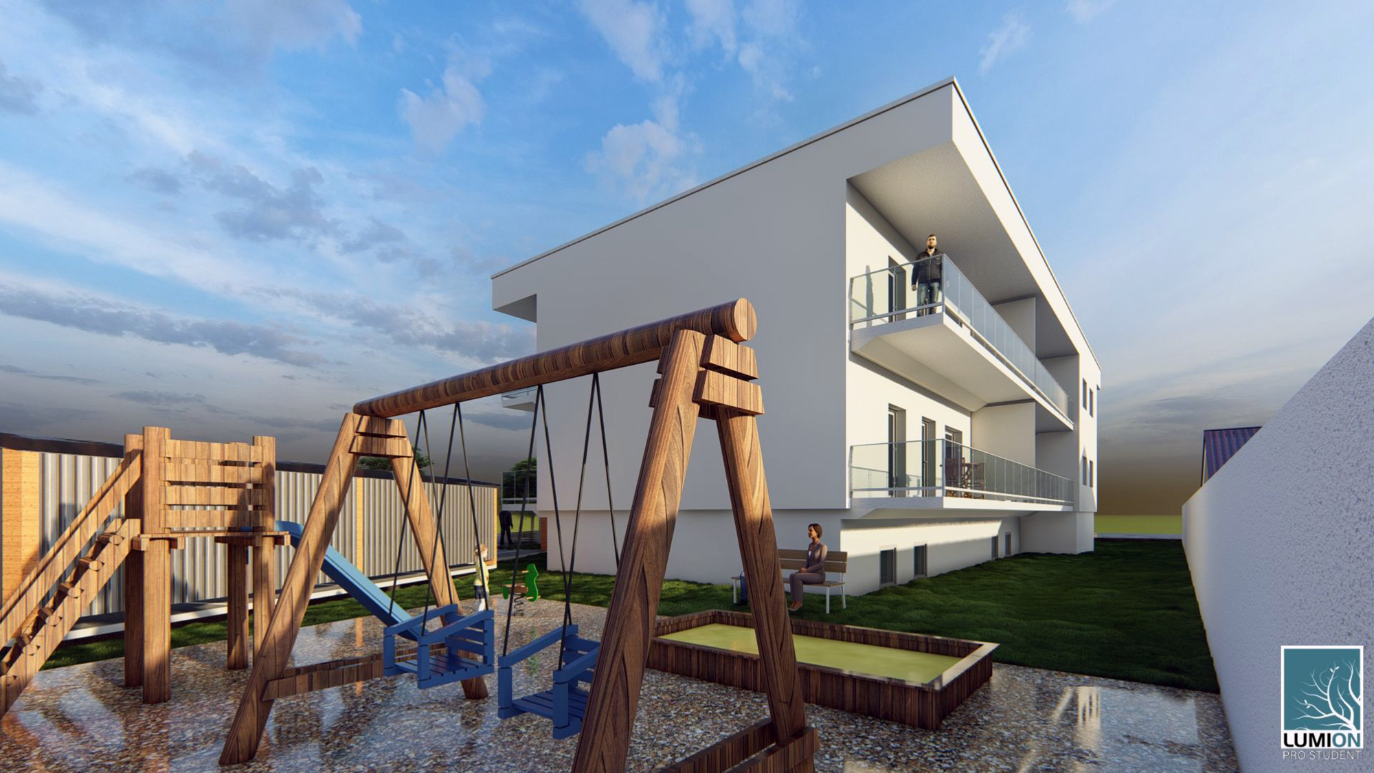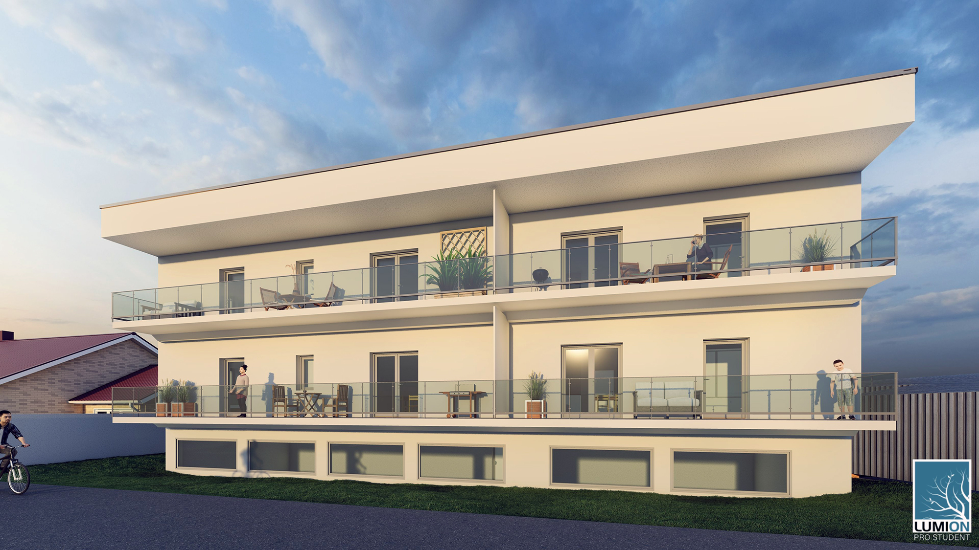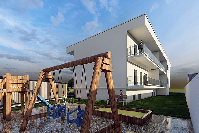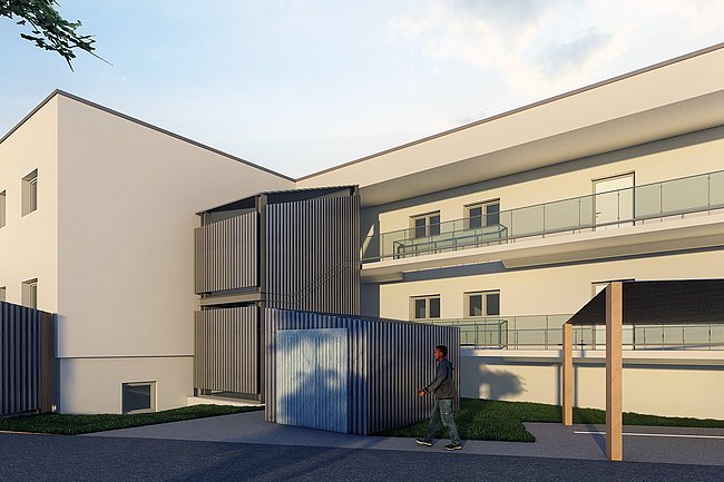 Es entstanden in einem intensiven Planungsprozess acht Dreizimmerwohnungen mit einer jeweiligen Nettofläche unter 70 m². Minimalismus war gefragt, das war die Herausforderung dieses sozialen Wohnbauprojekts. Mit dem Konzept eines Laubenganges wurden pro Stockwerk vier Wohnungen erschlossen, die Möglichkeit für den nachträglichen Einbau eines barrierefreien Lifts ist gegeben. Die Nebenräume, eine Spielplatzgestaltung und mehrere Parkplätze wurden trotz der Kleinheit des Grundstücks vorgesehen und mitgeplant.