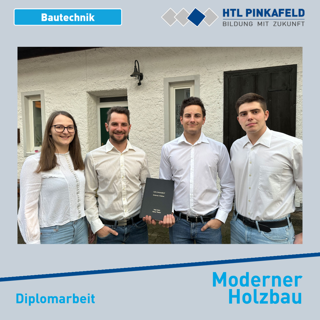 Im April wurde die Diplomarbeit „Moderner Holzbau“ von den Bautechnik-Maturanten Noah Freiler und Michael Winkler an die Auftraggeber David Freiler und Kerstin Puchegger übergeben. Betreut wurde diese Diplomarbeit von Prof. Hans Glatz.