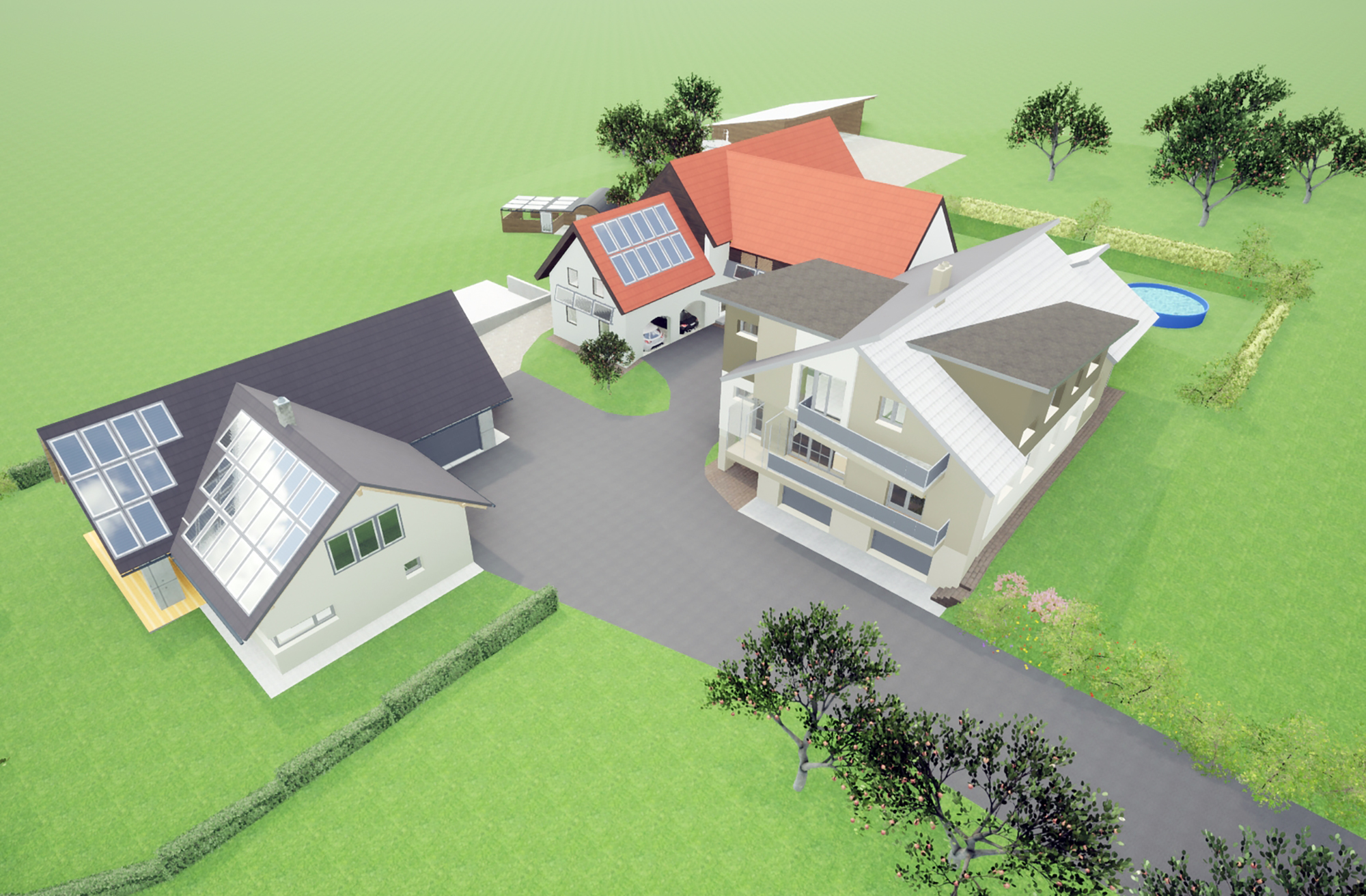 Der erste Schritt lag in der Vermessung der vorhandenen Gebäude und des Geländes. Anhand dieser Daten konnte ein Bestandsplan sowie 3D Visualisierungen angefertigt werden. In mehreren Besprechungen wurden die Ziele „Umbau zum Plusenergiehaus“, „Neugestaltung Erdgeschoß“ und „Neubau Haus im Garten“ konkretisiert. Um eine positive Energiebilanz zu erreichen, wurde eine Photovoltaikanlage, zur Erzeugung von Sonnenstrom, notwendig. So hatten die Diplomanden die Gelegenheit, sich mit dem Thema der Photovoltaik genauer zu befassen. Größe, Anordnung und Standort sowie die praktische Umsetzung wurden gemeinsam ausgearbeitet.