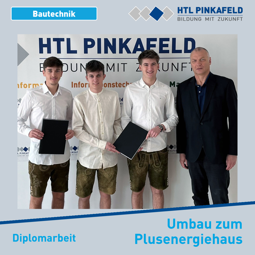 Kürzlich wurde die Diplomarbeit „Umbau – Neubau – PV“ von den Bautechnik-Maturanten Maximilian Handler, Jonas Kneißl und Michael Müller an die Auftraggeber, Familie Kneißl, übergeben. Betreut wurde die Arbeit von Prof. Thomas Wagner.