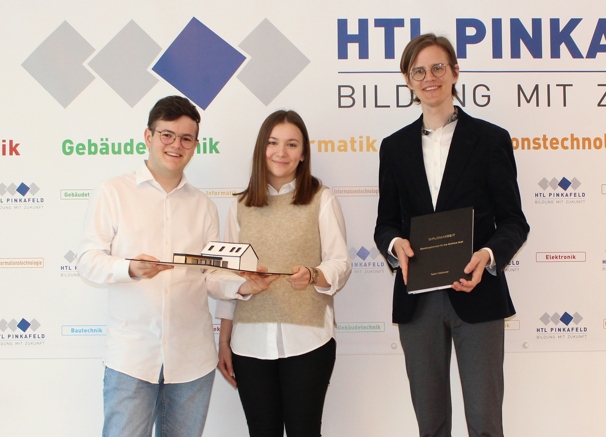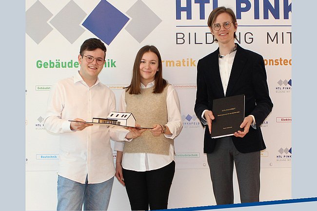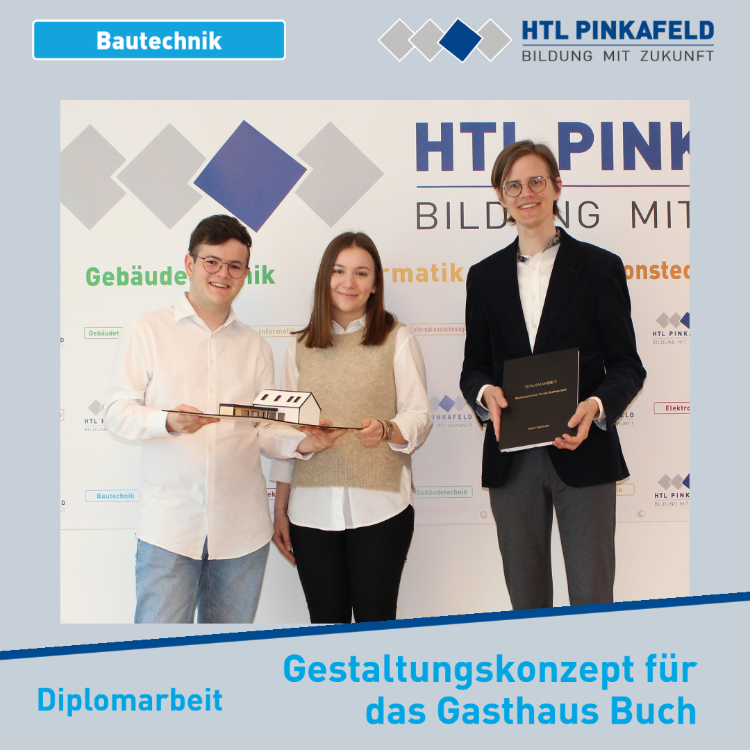 Im April wurde die Diplomarbeit „Gestaltungskonzept für das Gasthaus Buch“ von den Bautechnik-Maturanten Noreen Tanki und Jakob Widnhofer an den Betreuungslehrer Prof. Benjamin Sasdi übergeben.