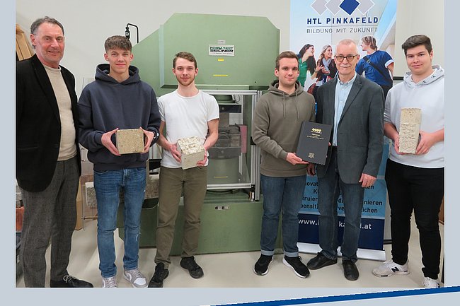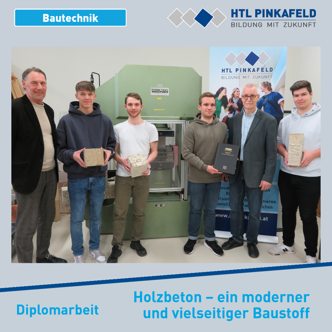 Mitte April wurde die Diplomarbeit „Holzbeton – ein moderner und vielseitiger Baustoff“ von den Bautechnik-Maturanten Sven Gravogl, Jürgen Glatz, Daniel Höfler und Robin Kortschak an die Betreuer Prof. Peter Derler und Prof. Peter Hofbauer übergeben.