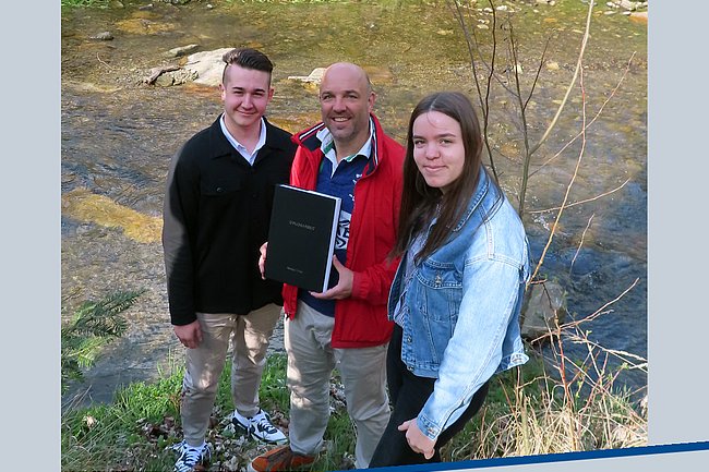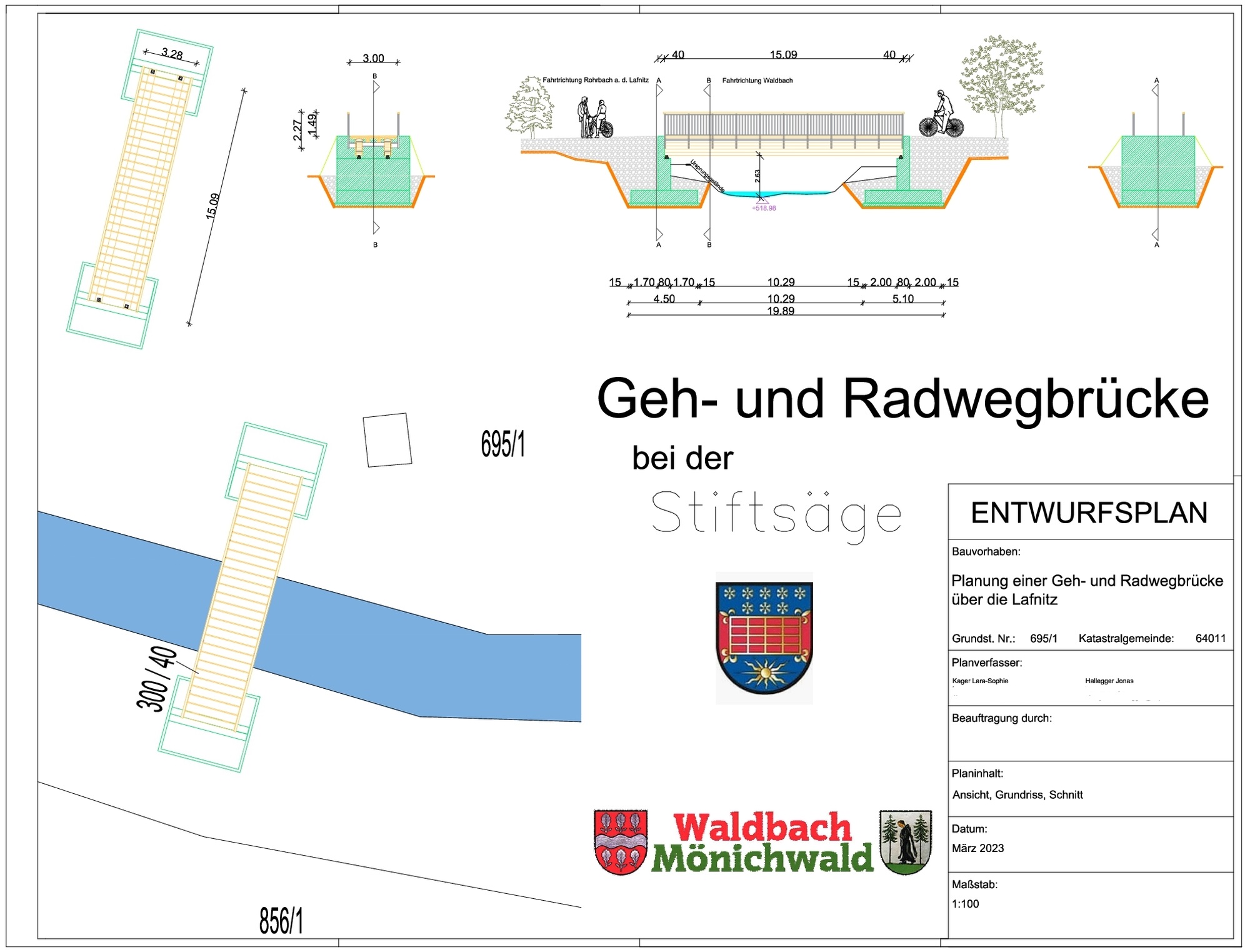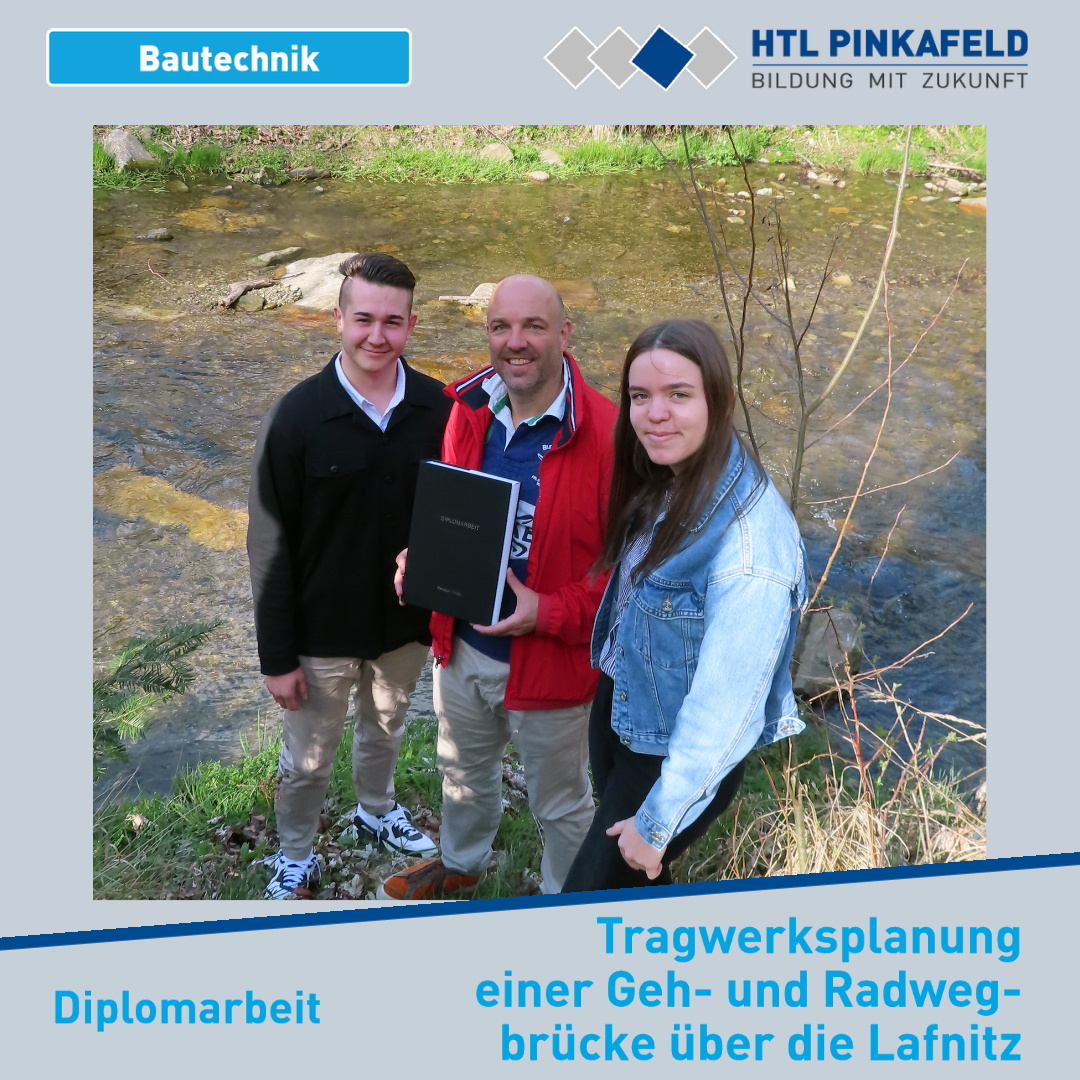 Ende April wurde die Diplomarbeit „Tragwerksplanung einer Geh- und Radwegbrücke über die Lafnitz“ am geplanten Standort im Bereich der „Stiftsäge“ von den Bautechnik-Maturanten Lara-Sophie Kager und Jonas Hallegger an den Betreuer Prof. Ulrich Spener übergeben.